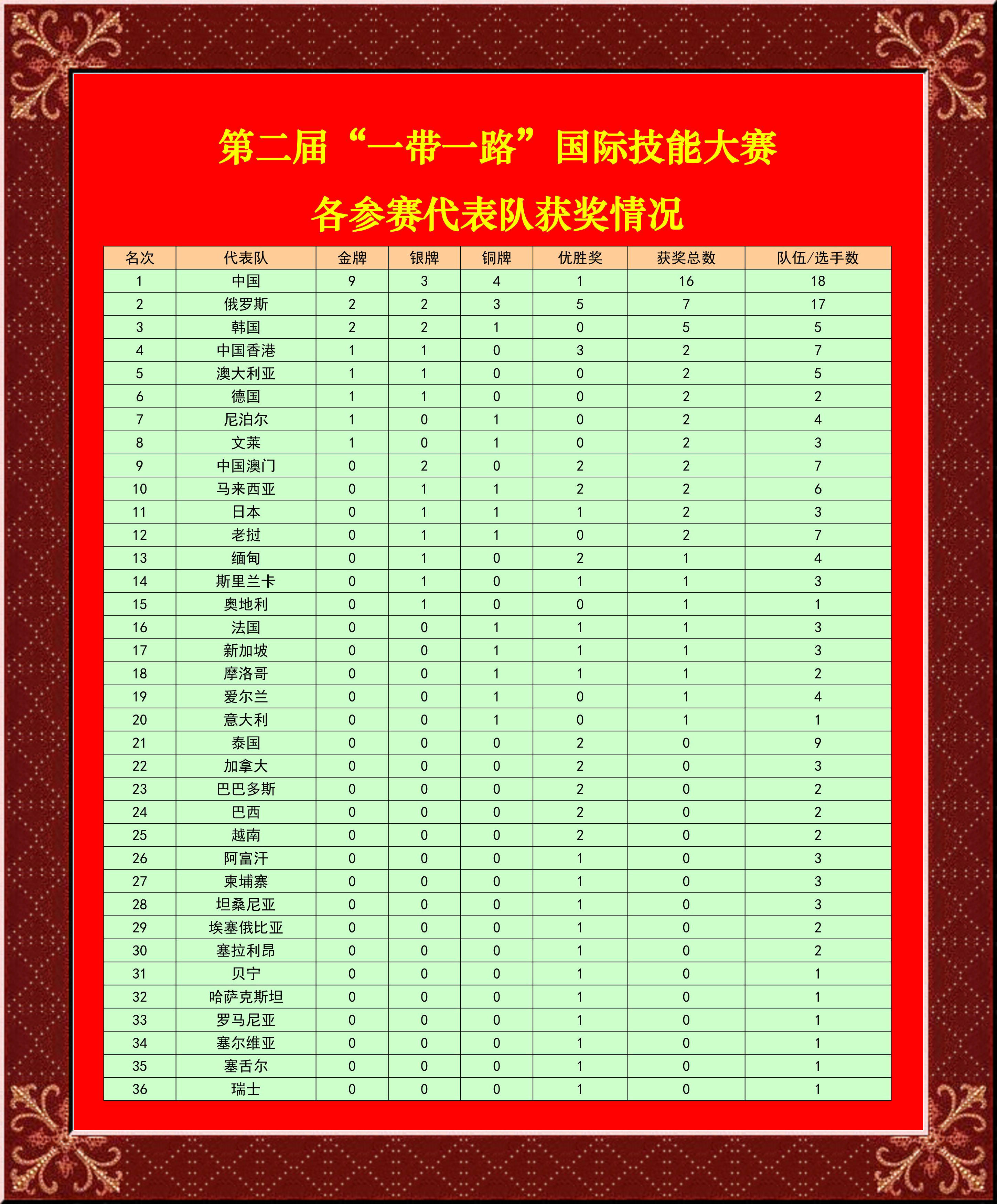 第二屆“一帶一路”國(guó)際技能大賽各參賽代表隊(duì)獲獎(jiǎng)情況