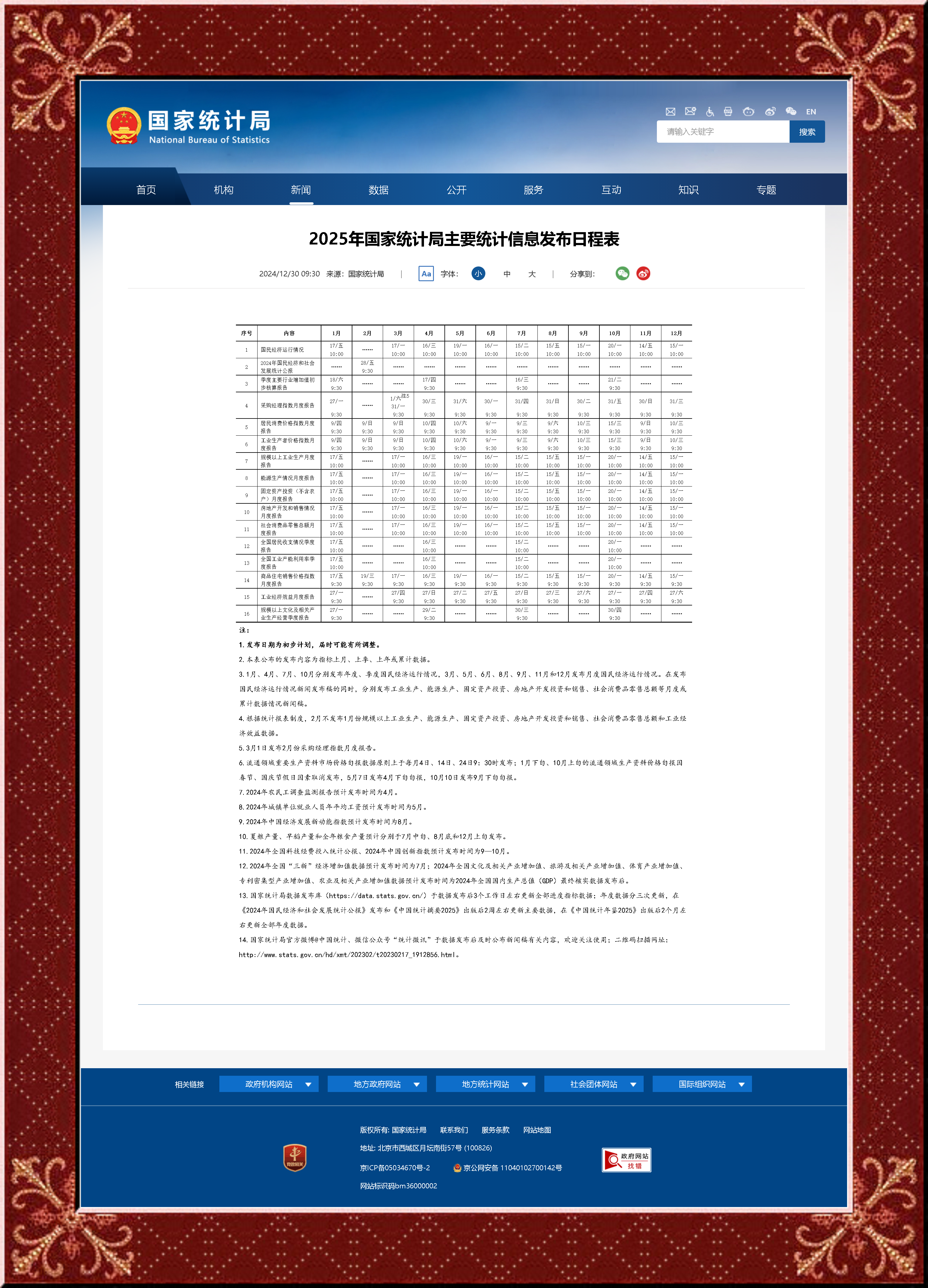 2025年國家統(tǒng)計局主要統(tǒng)計信息發(fā)布日程表