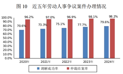 全年全國各級勞動人事爭議調(diào)解組織和仲裁機(jī)構(gòu)共辦理勞動人事爭議案件 425.7 萬涉及勞動者 454.9 萬人。全年辦結(jié)爭議案件 415.6 萬件,結(jié)案金額 934.7 億元。全年勞動人事爭議調(diào)解成功率 79.6%,仲裁結(jié)案率 98.2%,仲裁終結(jié)率73.7%。