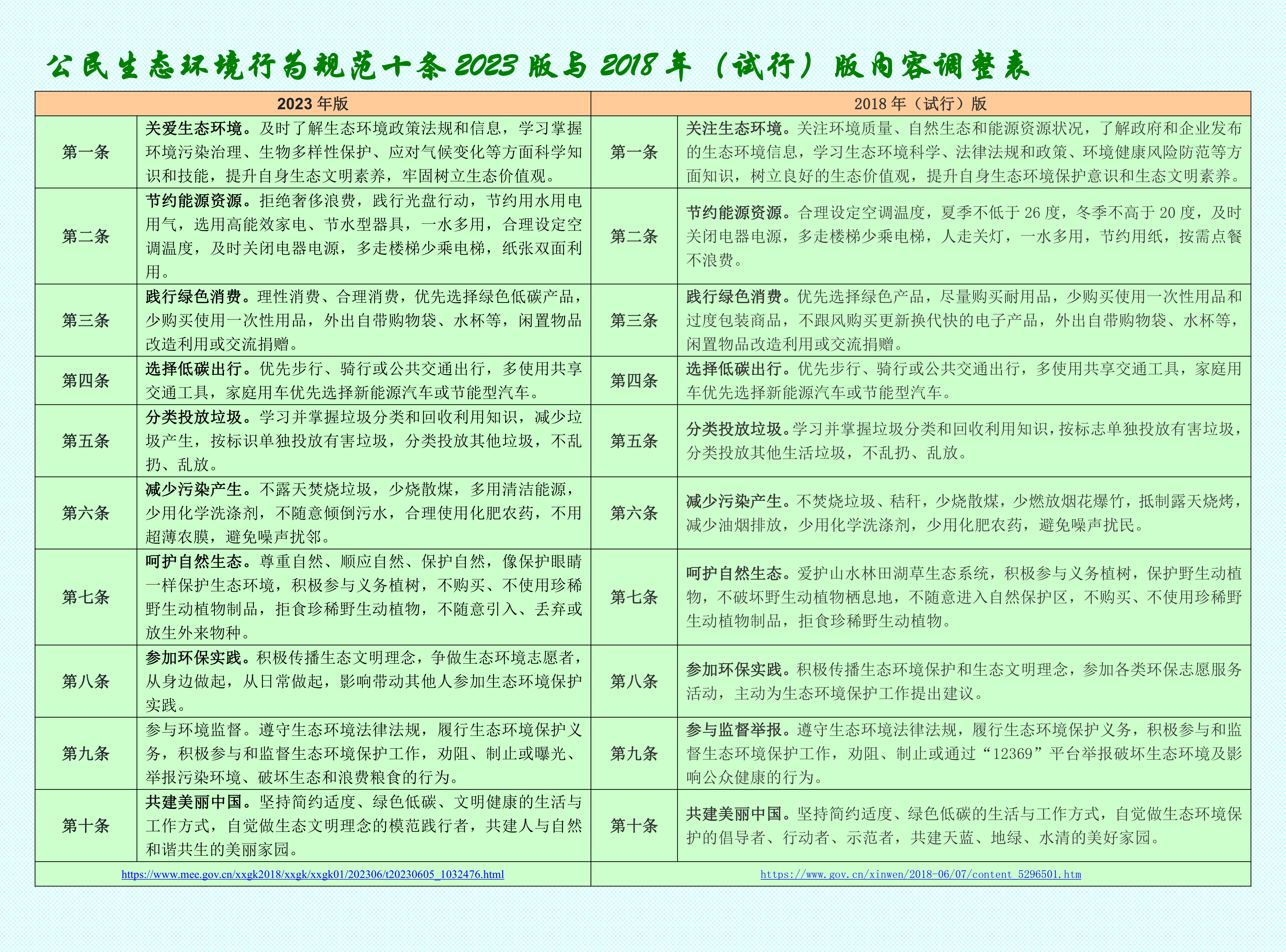 公民生態(tài)環(huán)境行為規(guī)范十條2023版與2018年試行版調整表