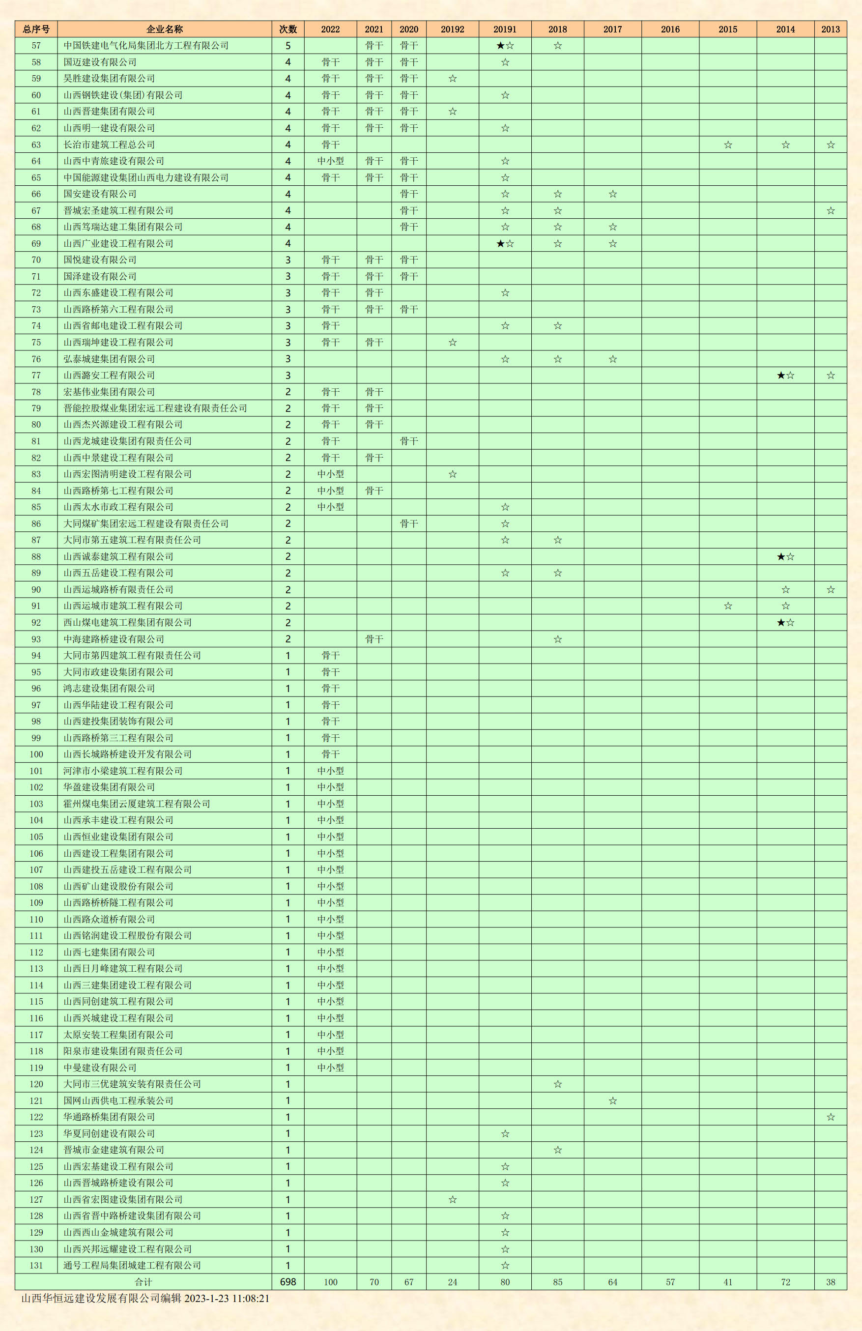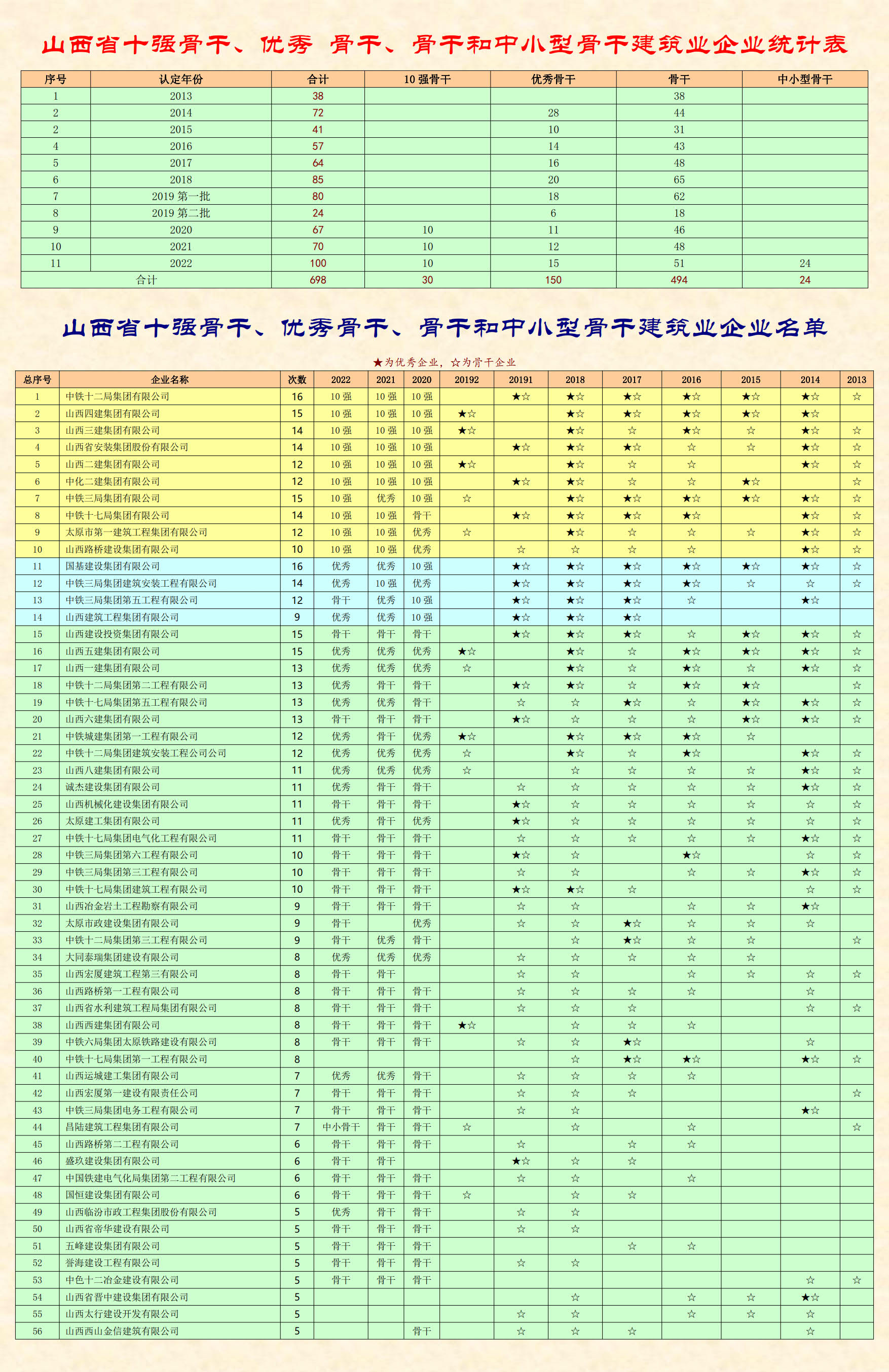 歷年山西省和太原市骨干、優(yōu)秀骨干 和10強(qiáng)骨干建筑業(yè)企業(yè)名單及統(tǒng)計(jì)表