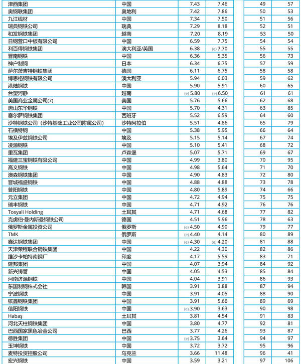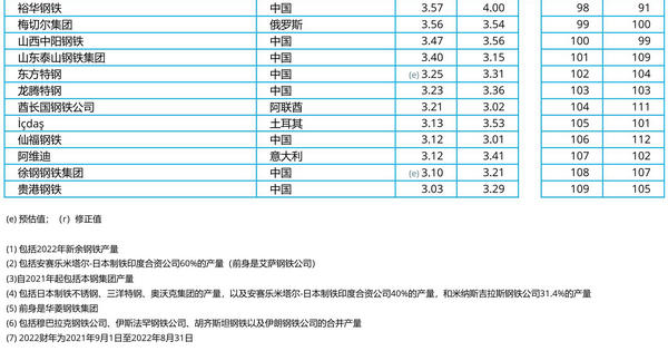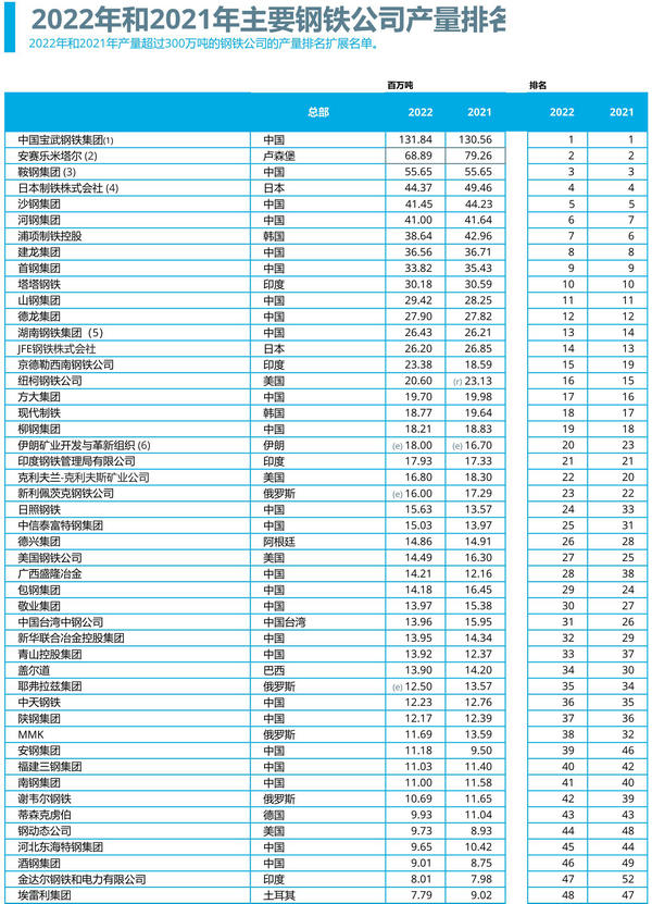 2022年主要鋼鐵公司產(chǎn)量排名
