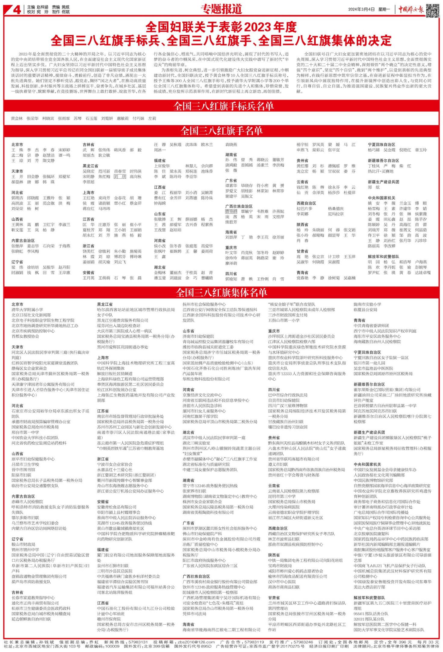 為表彰先進、樹立典型,進一步引領(lǐng)激勵廣大婦女跟黨奮進新征程、巾幗建功新時代,全國婦聯(lián)決定,授予黃會林等10人全國三八紅旗手標兵稱號,授予王殊等300人全國三八紅旗手稱號,授予清華大學(xué)附屬小學(xué)等200個單位全國三八紅旗集體稱號。希望受到表彰的先進個人和集體,珍惜榮譽、發(fā)揚成績,充分發(fā)揮示范表率作用,在新時代新征程上再立新功、再創(chuàng)佳績。