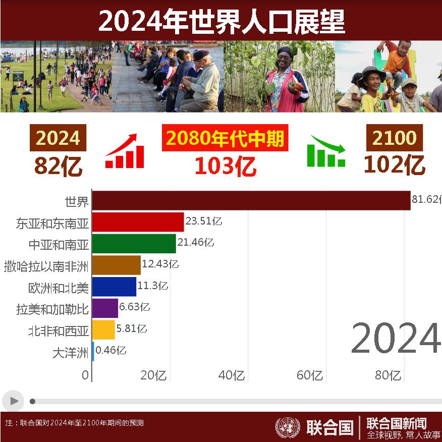 新華社聯(lián)合國7月11日電(記者王建剛)聯(lián)合國11日發(fā)布的《2024年世界人口展望:結(jié)果摘要》報(bào)告顯示,預(yù)計(jì)世界人口將在本世紀(jì)80年代中期達(dá)到約103億的峰值,到本世紀(jì)末回落至約102億。