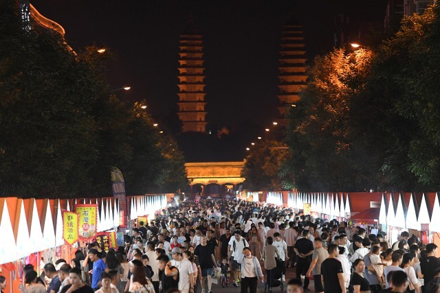 2024年7月16日,山西太原,雙塔寺前人山人海。豐富多彩的夜間主題活動,滿足人們舒適納涼的需求,進一步催熱“夏日夜經(jīng)濟”。視覺中國 資料圖