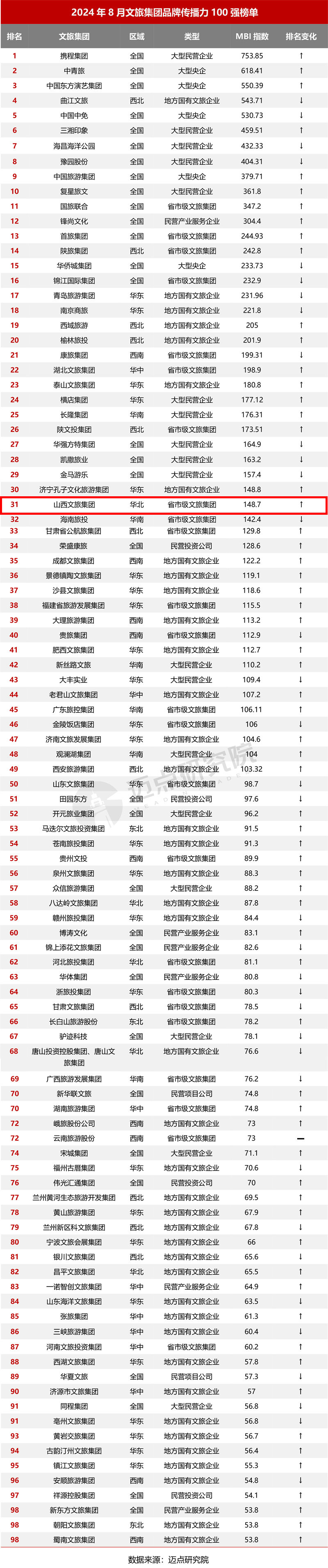 “2024年8月文旅集團(tuán)品牌傳播力100強(qiáng)榜單”數(shù)據(jù)來源于邁點(diǎn)品牌指數(shù)MBI,根據(jù)8月邁點(diǎn)品牌指數(shù)MBI的902個文旅集團(tuán)數(shù)據(jù)匯總統(tǒng)計而成。