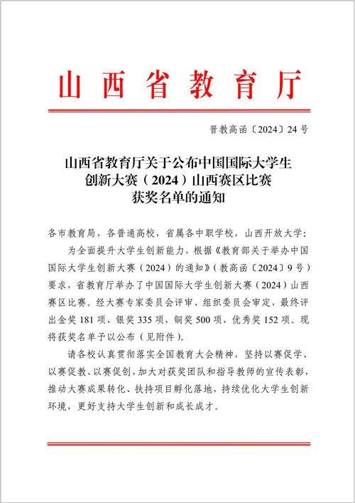 為全面提升大學(xué)生創(chuàng)新能力,根據(jù)教育部相關(guān)通知要求,省教育廳舉辦了中國國際大學(xué)生創(chuàng)新大賽(2024)山西賽區(qū)比賽。經(jīng)大賽專家委員會評審、組織委員會審定,最終評出金獎181項、銀獎335項、銅獎500項、優(yōu)秀獎152項。省教育廳日前公布了獲獎名單。