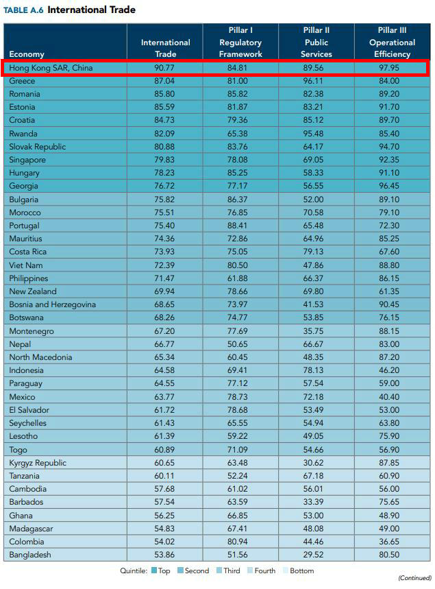 報(bào)告屬試行性質(zhì),以十項(xiàng)指標(biāo)及三個(gè)維度比較各個(gè)經(jīng)濟(jì)體在營(yíng)商環(huán)境方面的整體表現(xiàn)。在十項(xiàng)指標(biāo)當(dāng)中,香港獲最高分?jǐn)?shù)的三項(xiàng)分別是“國(guó)際貿(mào)易”(90.77分)、“市場(chǎng)準(zhǔn)入”(85.49分)及“市政公用基礎(chǔ)設(shè)施服務(wù)”(77.71分)。在三個(gè)維度當(dāng)中,香港在“辦事效率”維度的總體得分是78.52,排名第五。