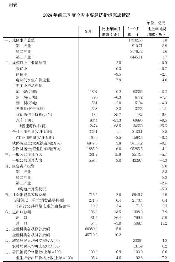 總的來看,前三季度全省經濟運行保持穩(wěn)定恢復態(tài)勢。尤其是進入三季度以來,隨著一系列宏觀政策成效逐步顯現,部分行業(yè)領域呈現積極變化,9月當月,全省固定資產投資增速較8月份由負轉正回升4.9個百分點,一般公共預算收入由負轉正回升16.0個百分點,限額以上消費品零售額由負轉正回升1.9個百分點,其中家用電器和音像器材類零售額加快18.2個百分點。但外部環(huán)境復雜嚴峻,經濟穩(wěn)增長基礎尚不牢固。下一步,全省上下要全面貫徹落實黨的二十屆三中全會精神,按照黨中央關于經濟工作的決策部署,圍繞省委、省政府工作重點,堅定發(fā)展信心、積極主動作為,補足短板弱項、增強內生動力,強化存量政策和增量政策協(xié)同發(fā)力,鞏固經濟穩(wěn)定運行、回升向好基礎,努力完成全年經濟社會發(fā)展目標任務。