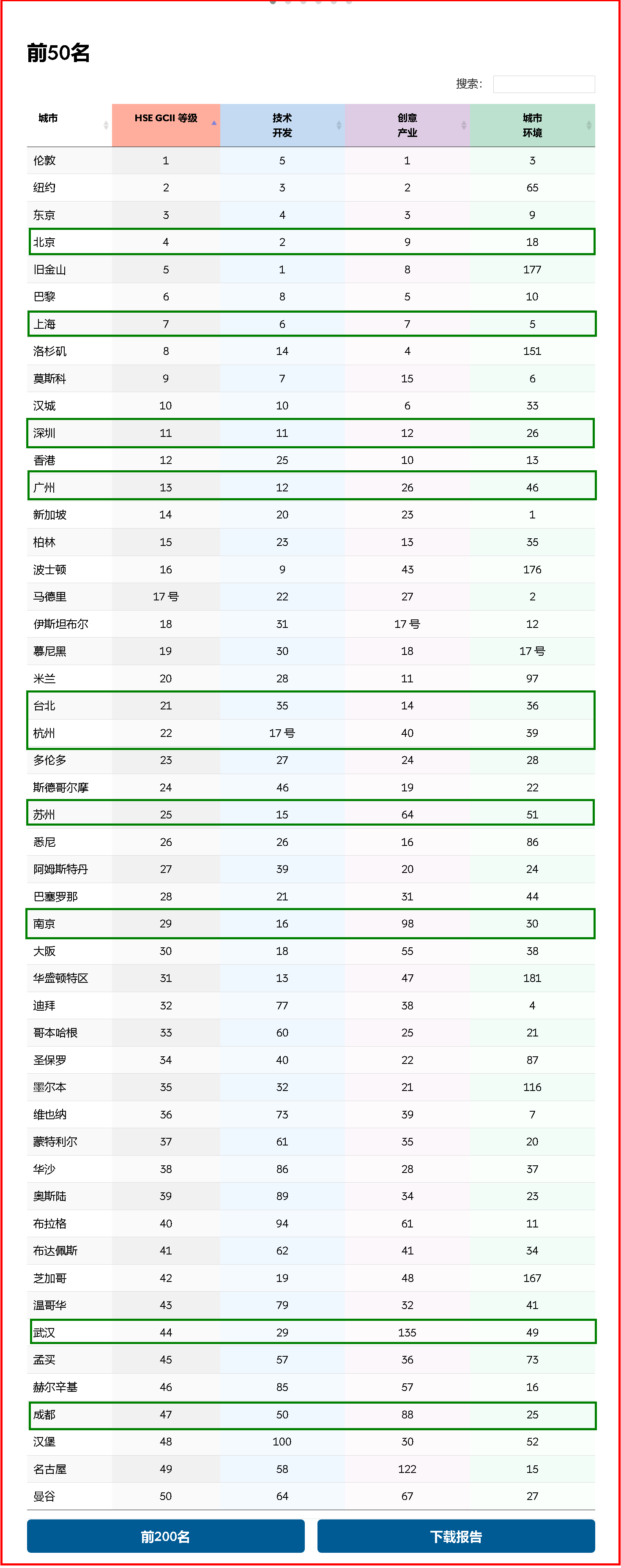 該分析報告包括一份包含1,127 個城市的擴(kuò)展名單 (其中已確定了兩個或以上技術(shù)和創(chuàng)意領(lǐng)導(dǎo)者),以及根據(jù) 90 項(xiàng)指標(biāo)(分為 21 個部分)的 2024 年200 個最具吸引力創(chuàng)新中心的短名單。三個板塊——技術(shù)發(fā)展、創(chuàng)意產(chǎn)業(yè)和城市環(huán)境)。