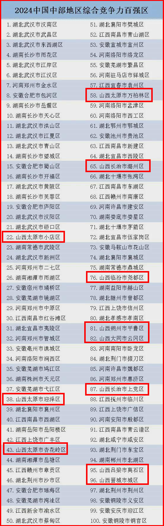 山西上榜的11個(gè)區(qū)中,太原市小店區(qū)、迎澤區(qū)、杏花嶺區(qū)、萬柏林區(qū)分別位列第22位、38位、43位、58位。其余為長治市潞州區(qū)、臨汾市堯都區(qū)、朔州市平魯區(qū)、大同市云岡區(qū)、長治市上黨區(qū)、呂梁市離石區(qū)、晉城市城區(qū),分別位列第65位、76位、81位、82位、87位、95位、96位。