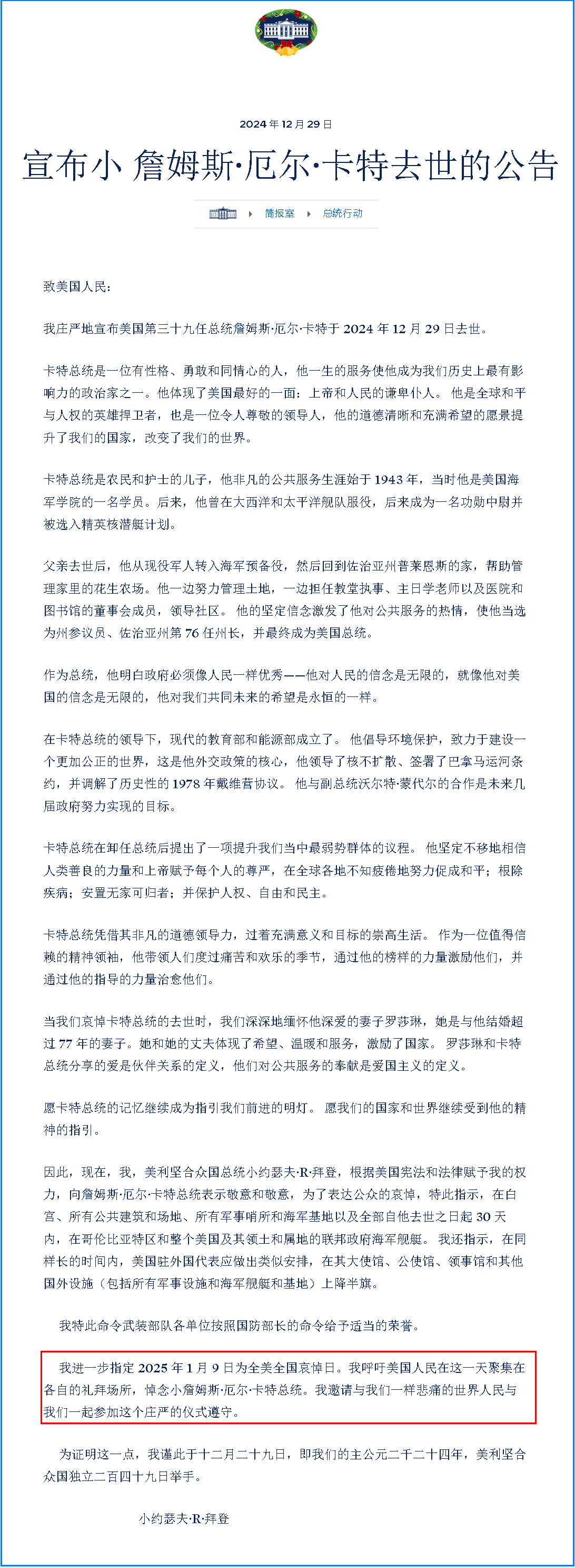 新華社華盛頓12月29日電 美國白宮29日說,2025年1月9日為全國哀悼日,美國總統(tǒng)拜登呼吁美國人民在那一天向前總統(tǒng)吉米·卡特“表達(dá)敬意”。