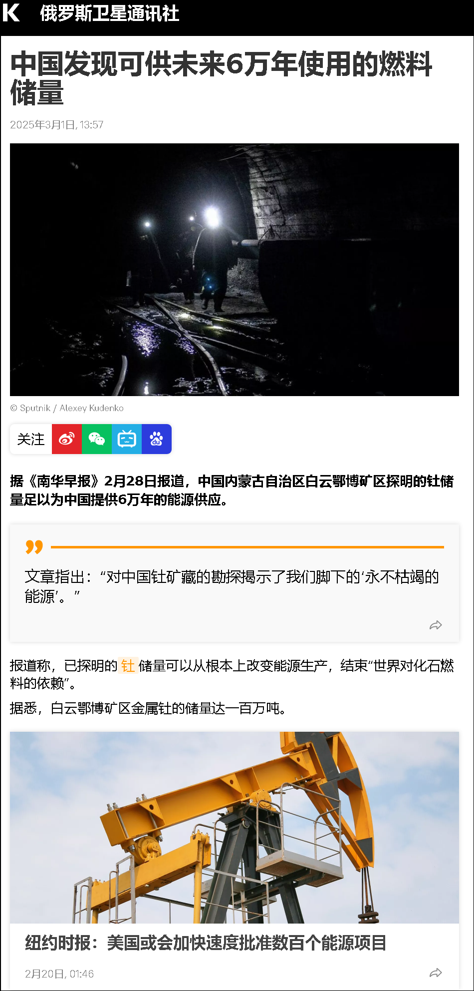 文章指出:“對(duì)中國釷礦藏的勘探揭示了我們腳下的‘永不枯竭的能源’。”
