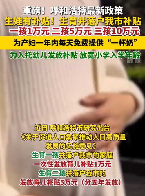 3月13日,內(nèi)蒙古呼和浩特市發(fā)布落實《關(guān)于促進人口集聚推動人口高質(zhì)量發(fā)展的實施意見》育兒補貼項目實施細則及服務(wù)流程。發(fā)放育兒補貼實施細則如下:生育一孩一次性發(fā)放育兒補貼1萬元;生育二孩發(fā)放育兒補貼5萬元,按照每年1萬元發(fā)放,直至孩子5周歲;生育三孩及以上發(fā)放育兒補貼10萬元,按照每年1萬元發(fā)放,直至孩子10周歲。