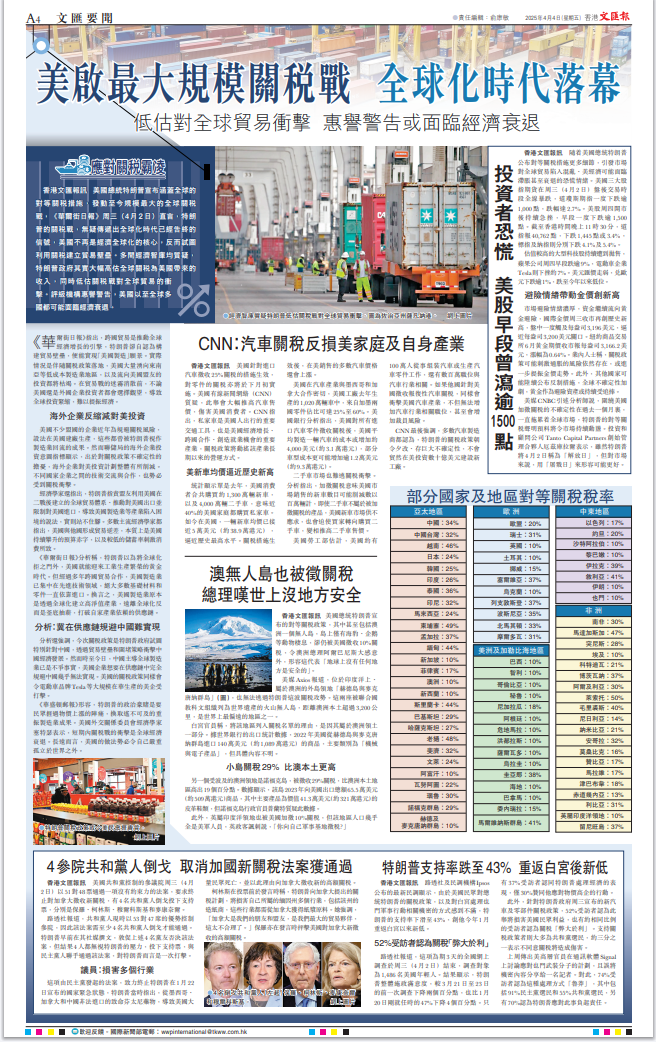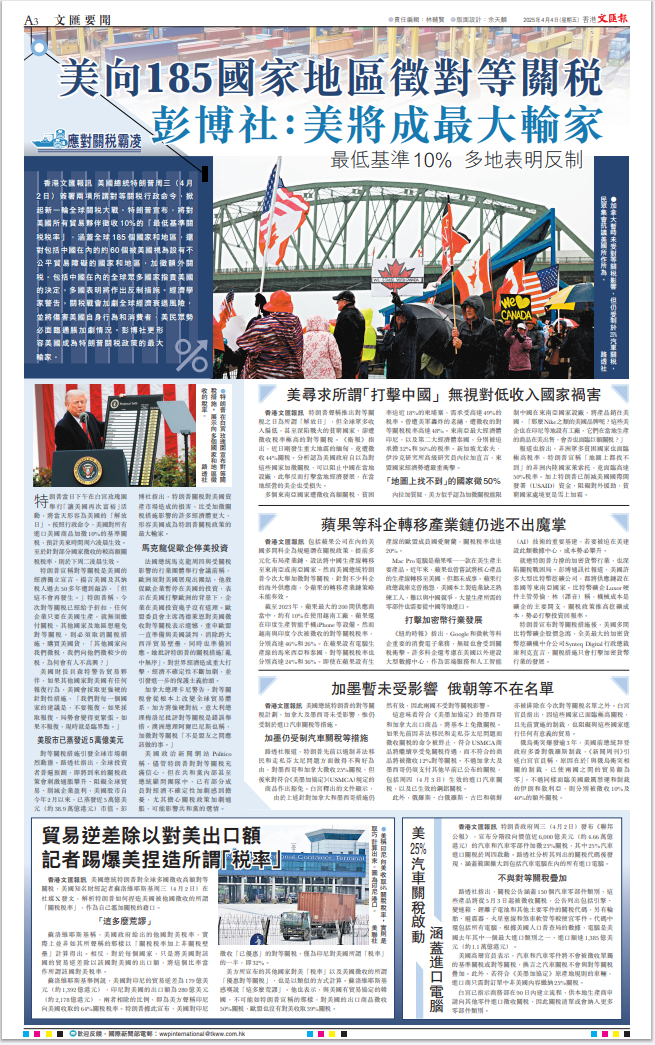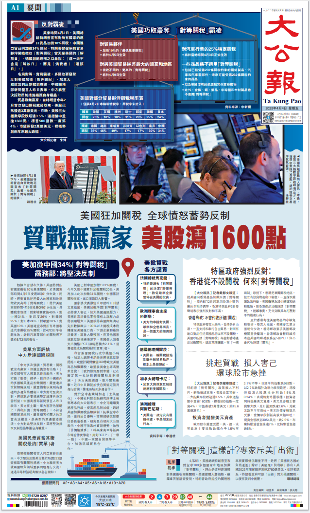 美國總統(tǒng)特朗普昨日發(fā)動(dòng)史無前例的關(guān)稅戰(zhàn),向全世界主要國家徵收巨額關(guān)稅。此舉進(jìn)一步暴露其霸權(quán)主義的真面目,遭到包括其盟友在內(nèi)所有國家的一致強(qiáng)烈反對。美股昨晚一度大跌1600點(diǎn),足以體現(xiàn)市場的態(tài)度。面對美國的野蠻霸道行徑,中國將採取必要措施堅(jiān)定維護(hù)自身權(quán)益。對香港特區(qū)來說,挑戰(zhàn)和機(jī)遇並存,既要正視美關(guān)稅戰(zhàn)帶來的衝擊,更要堅(jiān)定發(fā)展信心,加快融入國家發(fā)展大局,加大開拓新市場的力度,提升應(yīng)對風(fēng)浪的能力。