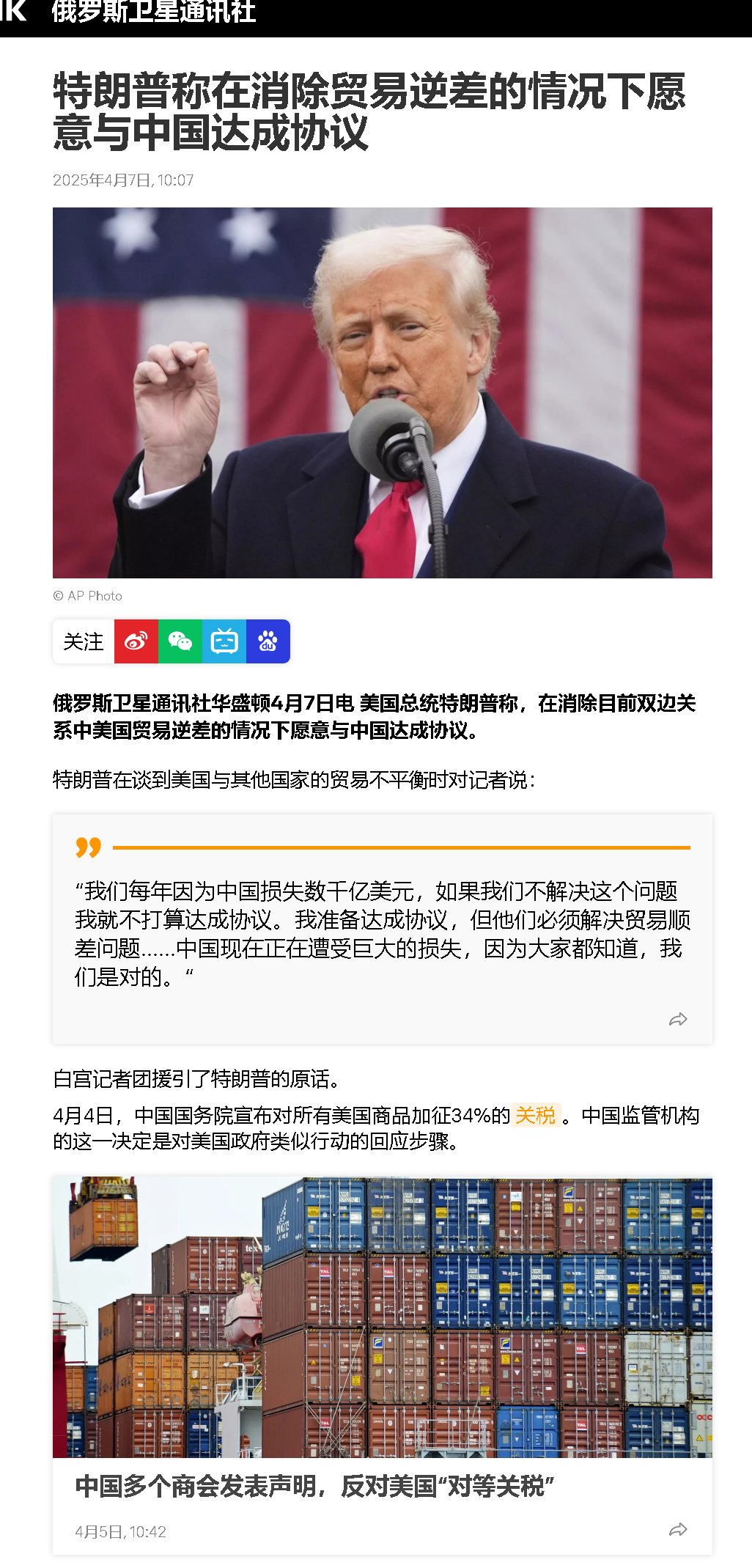 當(dāng)特朗普政府揮舞"對(duì)等關(guān)稅"大棒時(shí),其本質(zhì)是企圖用19世紀(jì)的殖民邏輯重構(gòu)21世紀(jì)的全球經(jīng)貿(mào)秩序。中國以精準(zhǔn)反制破局,不僅捍衛(wèi)了國家利益,更掀起了全球治理體系變革的浪潮。在這場重塑世界經(jīng)濟(jì)秩序的博弈中,中國以"開放型反制"戰(zhàn)略,構(gòu)建起多邊主義新范式。可以說,可能連特朗普都萬萬沒有想到,我國的反制這么的“快很準(zhǔn)”?;蛟S是迫于國內(nèi)民眾的壓力,特朗普的關(guān)稅態(tài)度出現(xiàn)轉(zhuǎn)變,提出減稅條件:只要美國和中國的貿(mào)易逆差問題能夠得到解決,就可以達(dá)到關(guān)稅和解協(xié)議。