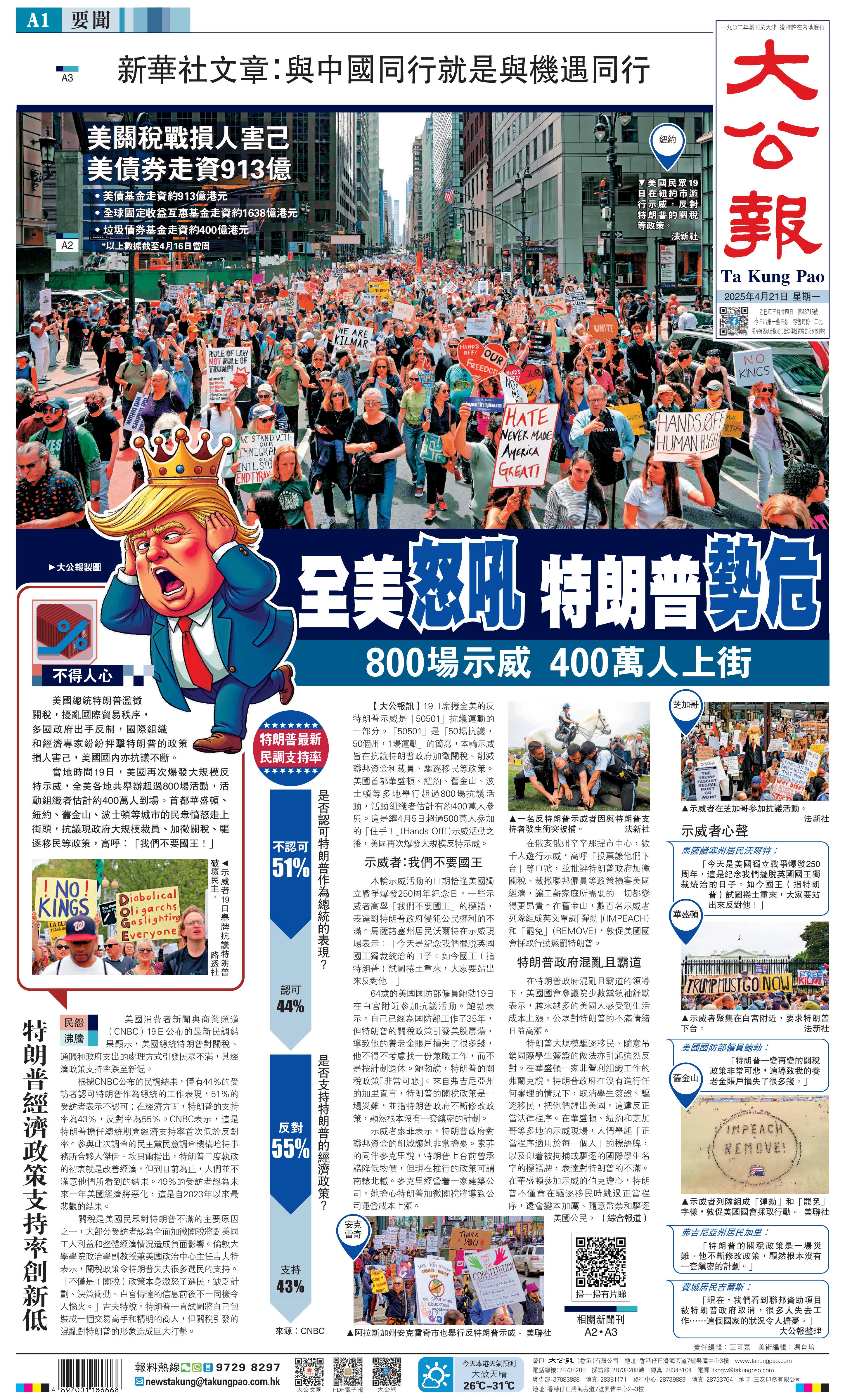 上圖:美國(guó)民眾19日在紐約市游行示威,反對(duì)特朗普的關(guān)稅等政策。 \法新社;左下圖:示威者19日舉牌抗議特朗普破壞民主。 \路透社;右下圖:阿拉斯加州安克雷奇市也舉行反特朗普示威。 \美聯(lián)社 上圖:美國(guó)民眾19日在紐約市游行示威,反對(duì)特朗普的關(guān)稅等政策。 \法新社;左下圖:示威者19日舉牌抗議特朗普破壞民主。 \路透社;右下圖:阿拉斯加州安克雷奇市也舉行反特朗普示威。 \美聯(lián)社
