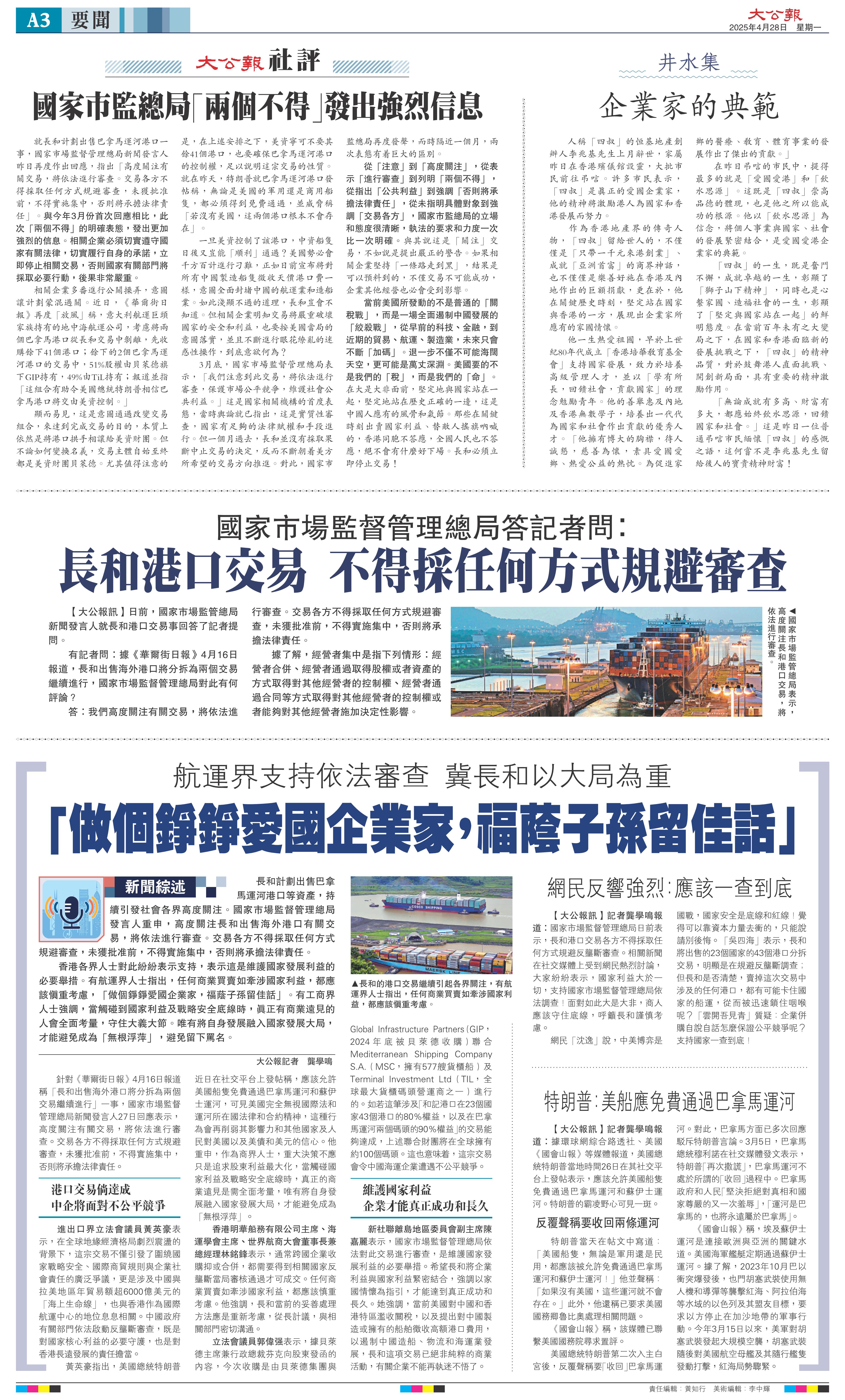 就長(zhǎng)和計(jì)劃出售巴拿馬運(yùn)河港口一事,國(guó)家市場(chǎng)監(jiān)督管理總局新聞發(fā)言人昨日再度作出回應(yīng),指出「高度關(guān)注有關(guān)交易,將依法進(jìn)行審查。交易各方不得采取任何方式規(guī)避審查,未獲批準(zhǔn)前,不得實(shí)施集中,否則將承擔(dān)法律責(zé)任」。與今年3月份首次回應(yīng)相比,此次「兩個(gè)不得」的明確表態(tài),發(fā)出更加強(qiáng)烈的信息。相關(guān)企業(yè)必須切實(shí)遵守國(guó)家有關(guān)法律,切實(shí)履行自身的承諾,立即停止相關(guān)交易,否則國(guó)家有關(guān)部門將采取必要行動(dòng),后果非常嚴(yán)重。