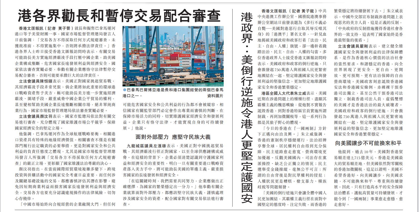 九龍城區(qū)議員左匯雄表示,美國(guó)正對(duì)中國(guó)挑起貿(mào)易戰(zhàn),其經(jīng)濟(jì)霸凌行徑正對(duì)國(guó)家,以至全球供應(yīng)鏈構(gòu)成威脅。在這樣的背景下,企業(yè)必須清楚認(rèn)識(shí)到守護(hù)國(guó)家利益和經(jīng)濟(jì)安全的重要性,明白一旦有關(guān)重要港口戰(zhàn)略資產(chǎn)落入美方手中,將可能助長(zhǎng)美國(guó)的單邊主義,嚴(yán)重?fù)p害國(guó)家的長(zhǎng)遠(yuǎn)發(fā)展和經(jīng)濟(jì)安全。