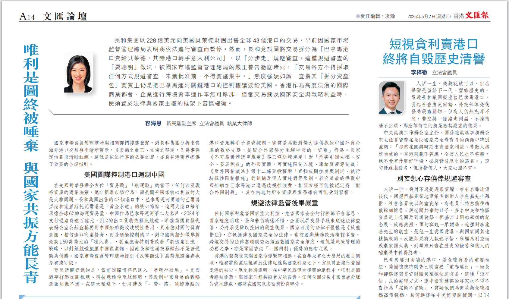 任何國家對危害國家重大利益、危害國家安全的行徑都不會容忍。國家態(tài)度明確,長和若仍執(zhí)迷不悟,企圖玩弄交易手段來規(guī)避法律監(jiān)管,必將承受難以挽回的嚴重后果。國家可用的法律不僅僅是《反壟斷法》,亦包括涉及國家安全的法律。當(dāng)前國際地緣政治復(fù)雜多變,跨境交易的法律盡職調(diào)查必須涵蓋國家安全維度,這既是風(fēng)險管理的必要之舉,亦是鞏固香港「一國兩制」優(yōu)勢的應(yīng)有之義。