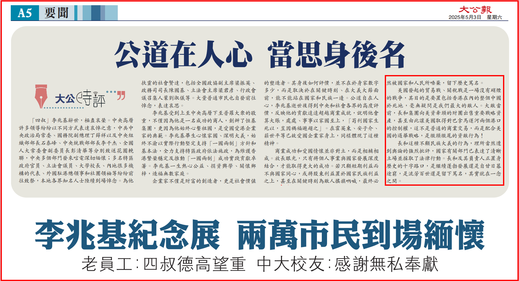 企業(yè)家不僅是財富的創(chuàng)造者,更是社會價值的塑造者。其身后如何評價,并不在于身家數(shù)字多少,而是取決于在關(guān)鍵時刻、在大義大節(jié)面前,能不能站在國家和民族一邊。公道自在人心,李兆基逝世后得到中央和社會各界的高度評價,反映他的貢獻遠遠超越商業(yè)成就,說明他會算大賬,處處、事事以家國至上,「茍利國家生死以,豈因禍福避趨之」。在霍英東、安子介、莊世平等已故愛國企業(yè)家身上,同樣體現(xiàn)了這種精神。