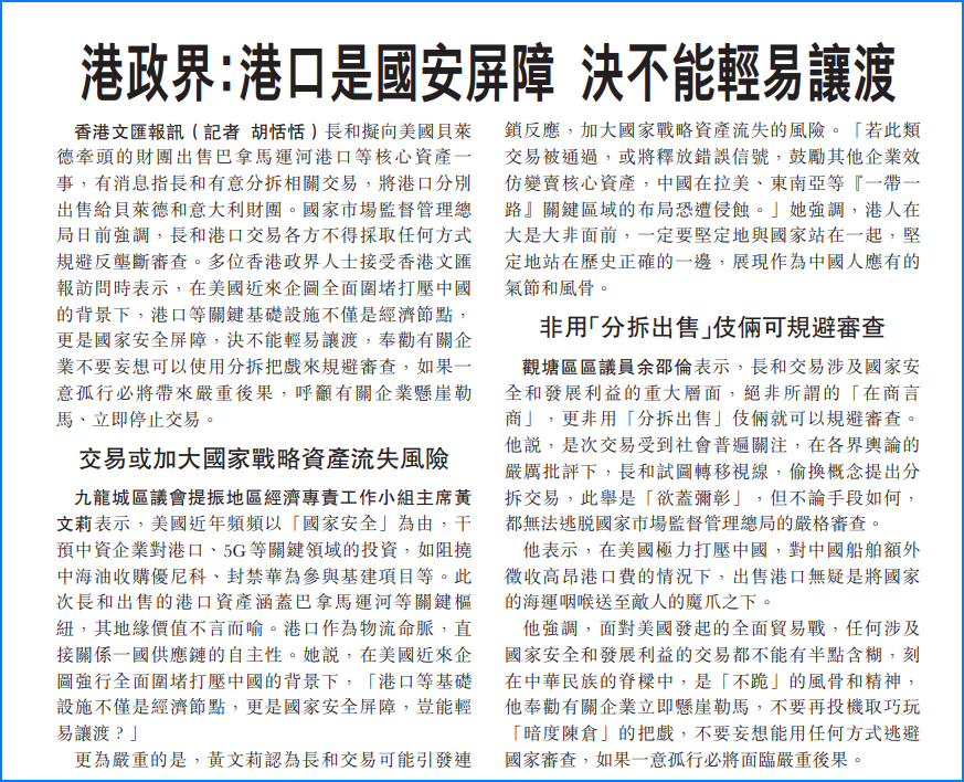 更為嚴(yán)重的是,黃文莉認(rèn)為長(zhǎng)和交易可能引發(fā)連鎖反應(yīng),加大國(guó)家戰(zhàn)略資產(chǎn)流失的風(fēng)險(xiǎn)。 「若此類(lèi)交易被通過(guò),或?qū)⑨尫佩e(cuò)誤信號(hào),鼓勵(lì)其他企業(yè)效仿變賣(mài)核心資產(chǎn),中國(guó)在拉美、東南亞等『一帶一路』關(guān)鍵區(qū)域的布局恐遭侵蝕?!顾龔?qiáng)調(diào),港人在大是大非面前,一定要堅(jiān)定地與國(guó)家站在一起,堅(jiān)定地站在歷史正確的一邊,展現(xiàn)作為中國(guó)人應(yīng)有的氣節(jié)和風(fēng)骨。
