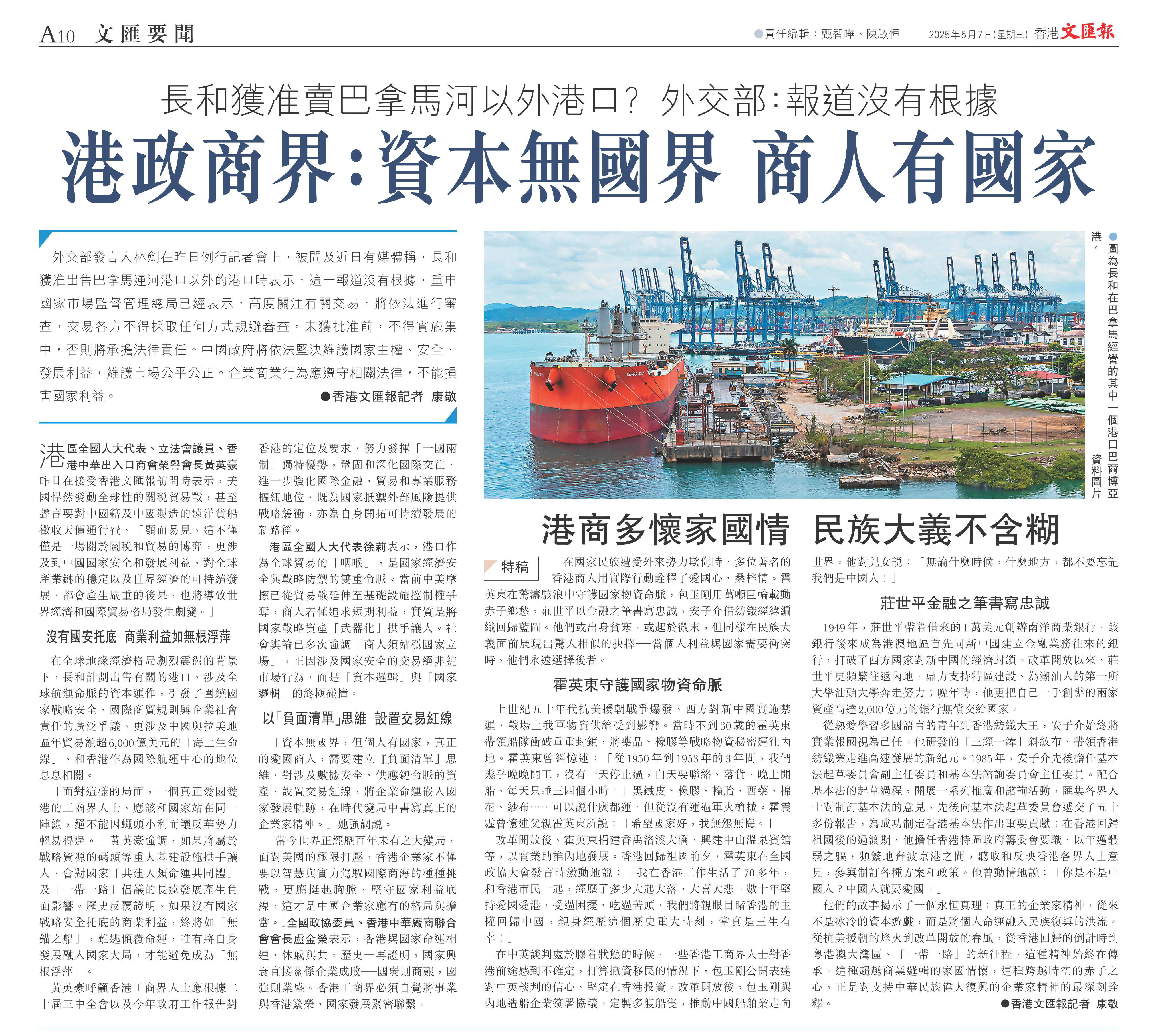 「面對這樣的局面,一個真正愛國愛港的工商界人士,應該和國家站在同一陣線,絕不能因蠅頭小利而讓反華勢力輕易得逞?!裹S英豪強調(diào),如果將屬于戰(zhàn)略資源的碼頭等重大基建設施拱手讓人,會對國家「共建人類命運共同體」及「一帶一路」倡議的長遠發(fā)展產(chǎn)生負面影響。歷史反覆證明,如果沒有國家戰(zhàn)略安全托底的商業(yè)利益,終將如「無錨之船」,難逃傾覆命運,唯有將自身發(fā)展融入國家大局,才能避免成為「無根浮萍」。
