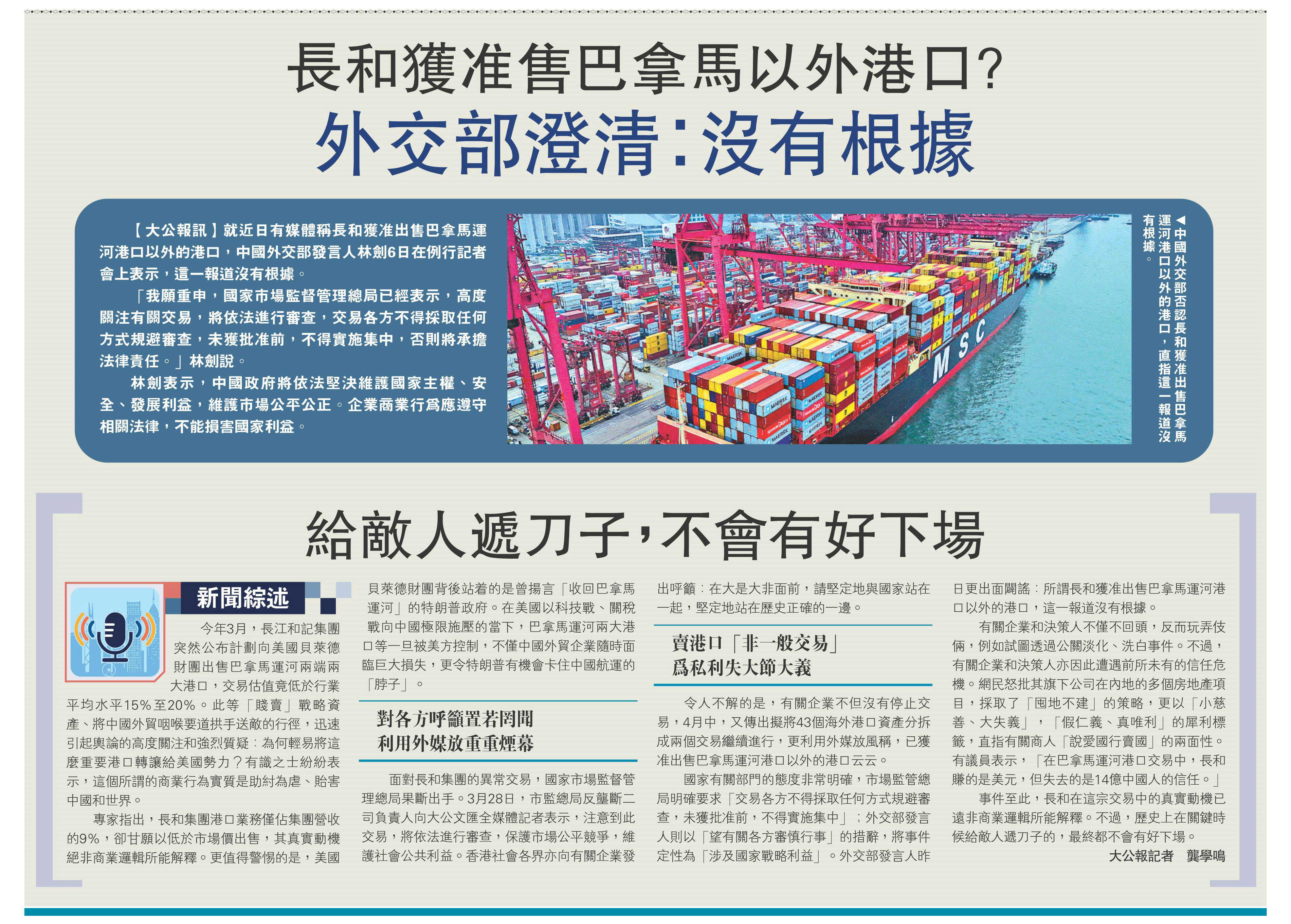 國(guó)家有關(guān)部門的態(tài)度非常明確,市場(chǎng)監(jiān)管總局明確要求「交易各方不得采取任何方式規(guī)避審查,未獲批準(zhǔn)前,不得實(shí)施集中」;外交部發(fā)言人則以「望有關(guān)各方審慎行事」的措辭,將事件定性為「涉及國(guó)家戰(zhàn)略利益」。外交部發(fā)言人昨日更出面辟謠:所謂長(zhǎng)和獲準(zhǔn)出售巴拿馬運(yùn)河港口以外的港口,這一報(bào)道沒(méi)有根據(jù)。