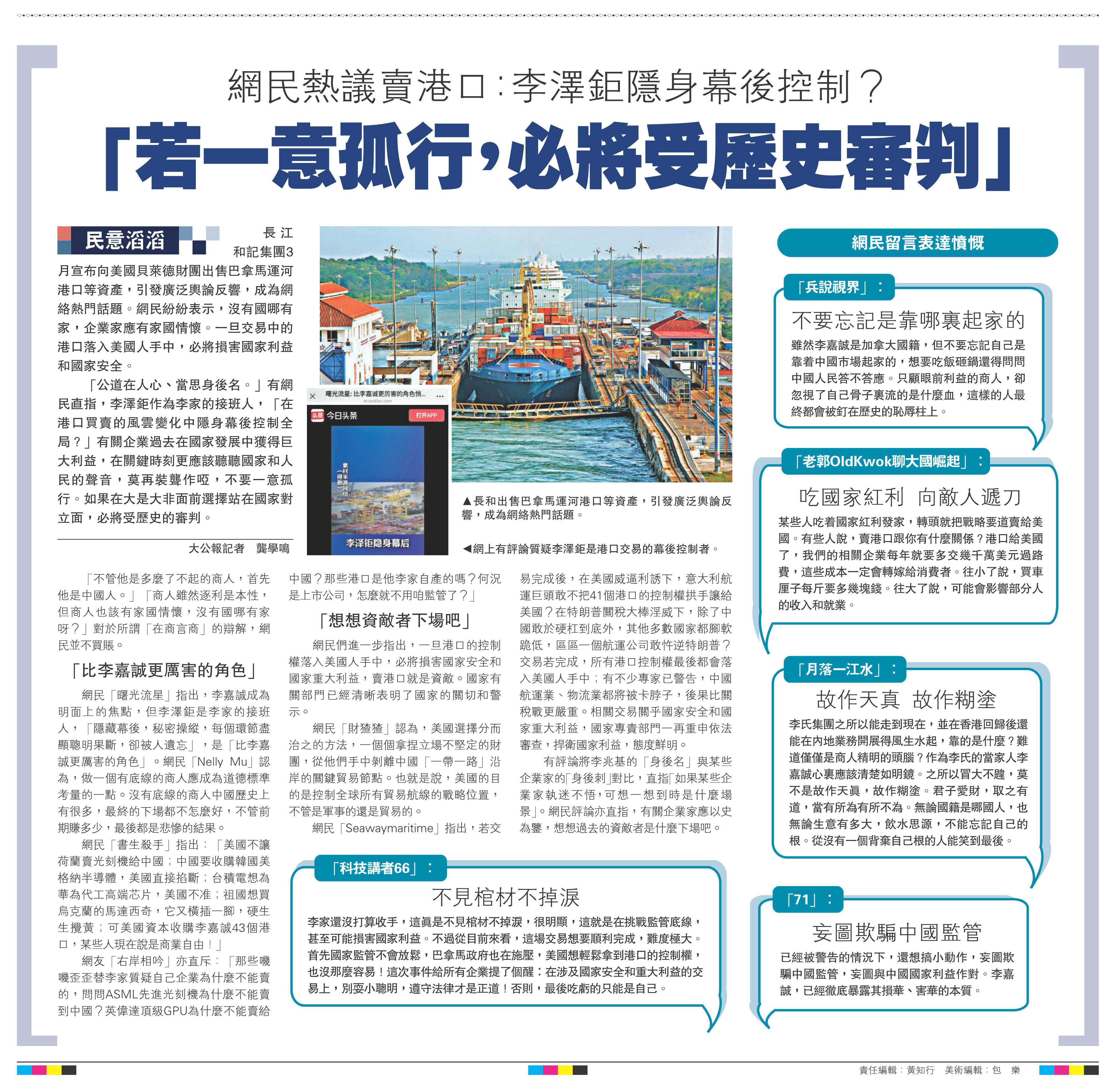 「公道在人心、當(dāng)思身后名。」有網(wǎng)民直指,李澤巨作為李家的接班人,「在港口買賣的風(fēng)云變化中隱身幕后控制全局?」有關(guān)企業(yè)過去在國家發(fā)展中獲得巨大利益,在關(guān)鍵時(shí)刻更應(yīng)該聽聽國家和人民的聲音,莫再裝聾作啞,不要一意孤行。如果在大是大非面前選擇站在國家對立面,必將受歷史的審判。 \大公報(bào)記者龔學(xué)鳴