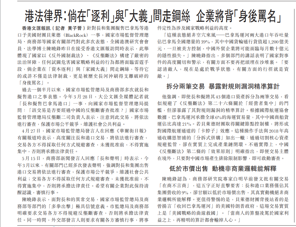 香港文匯報(bào)訊(記者黃子晉)針對(duì)長(zhǎng)和集團(tuán)擬售巴拿馬等港口予美國(guó)財(cái)團(tuán)貝萊德(BlackRock)一事,國(guó)家市場(chǎng)監(jiān)督管理總局、商務(wù)部等國(guó)家有關(guān)部門(mén)對(duì)此多次表態(tài),全國(guó)港澳研究會(huì)會(huì)員、法學(xué)博士陳曉鋒昨日在接受香港文匯報(bào)訪(fǎng)問(wèn)時(shí)表示,此舉體現(xiàn)了國(guó)家以《反外國(guó)制裁法》、《反壟斷法》構(gòu)建了嚴(yán)密的法治屏障,任何試圖危害國(guó)家戰(zhàn)略利益的行為都將面臨雷霆手段,倘企業(yè)在「資本逐利」與「家國(guó)大義」間走鋼絲,等待它的或許不僅是法律制裁,更是被歷史長(zhǎng)河沖刷得支離破碎的「身后罵名」。