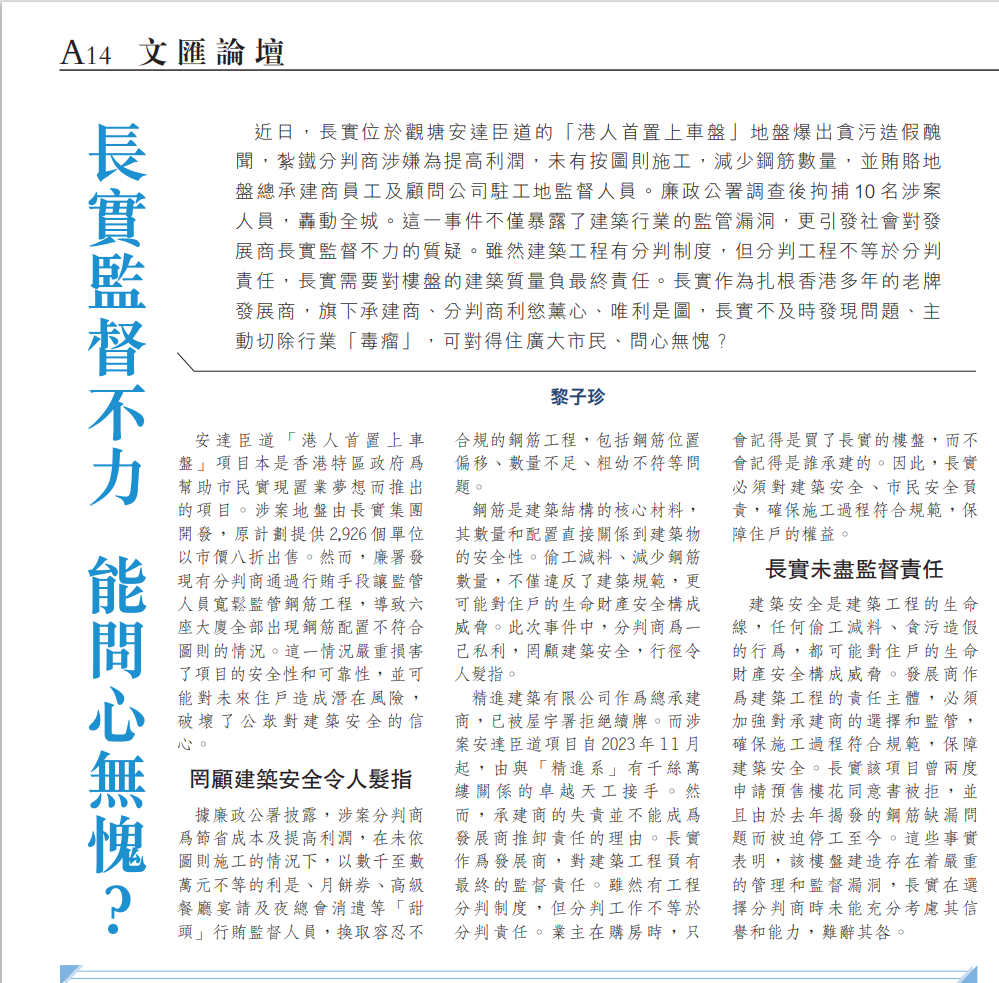 近日,長(zhǎng)實(shí)位于觀塘安達(dá)臣道的「港人首置上車盤」地盤爆出貪污造假丑聞,扎鐵分判商涉嫌為提高利潤(rùn),未有按圖則施工,減少鋼筋數(shù)量,并賄賂地盤總承建商員工及顧問(wèn)公司駐工地監(jiān)督人員。廉政公署調(diào)查后拘捕10名涉案人員,轟動(dòng)全城。這一事件不僅暴露了建筑行業(yè)的監(jiān)管漏洞,更引發(fā)社會(huì)對(duì)發(fā)展商長(zhǎng)實(shí)監(jiān)督不力的質(zhì)疑。雖然建筑工程有分判制度,但分判工程不等于分判責(zé)任,長(zhǎng)實(shí)需要對(duì)樓盤的建筑質(zhì)量負(fù)最終責(zé)任。長(zhǎng)實(shí)作為扎根香港多年的老牌發(fā)展商,旗下承建商、分判商利欲薰心、唯利是圖,長(zhǎng)實(shí)不及時(shí)發(fā)現(xiàn)問(wèn)題、主動(dòng)切除行業(yè)「毒瘤」,可對(duì)得住廣大市民、問(wèn)心無(wú)愧?