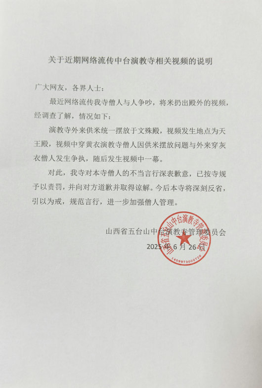 6月26日,有網(wǎng)民在網(wǎng)絡(luò)發(fā)布五臺山中臺演教寺相關(guān)視頻,引起廣大網(wǎng)友關(guān)注。五臺山風(fēng)景名勝區(qū)統(tǒng)戰(zhàn)宗教局和五臺山佛教協(xié)會立即對相關(guān)情況進(jìn)行了調(diào)查核實(shí)。調(diào)查情況為:6月22日,僧人釋某全帶領(lǐng)信眾進(jìn)入中臺演教寺天王殿供米,按照寺院規(guī)定,寺院文殊殿統(tǒng)一接收信眾的供養(yǎng),釋某全與天王殿守殿僧人釋某道因供養(yǎng)地點(diǎn)發(fā)生爭執(zhí),釋某道將米扔出殿外,且態(tài)度粗暴,影響惡劣。