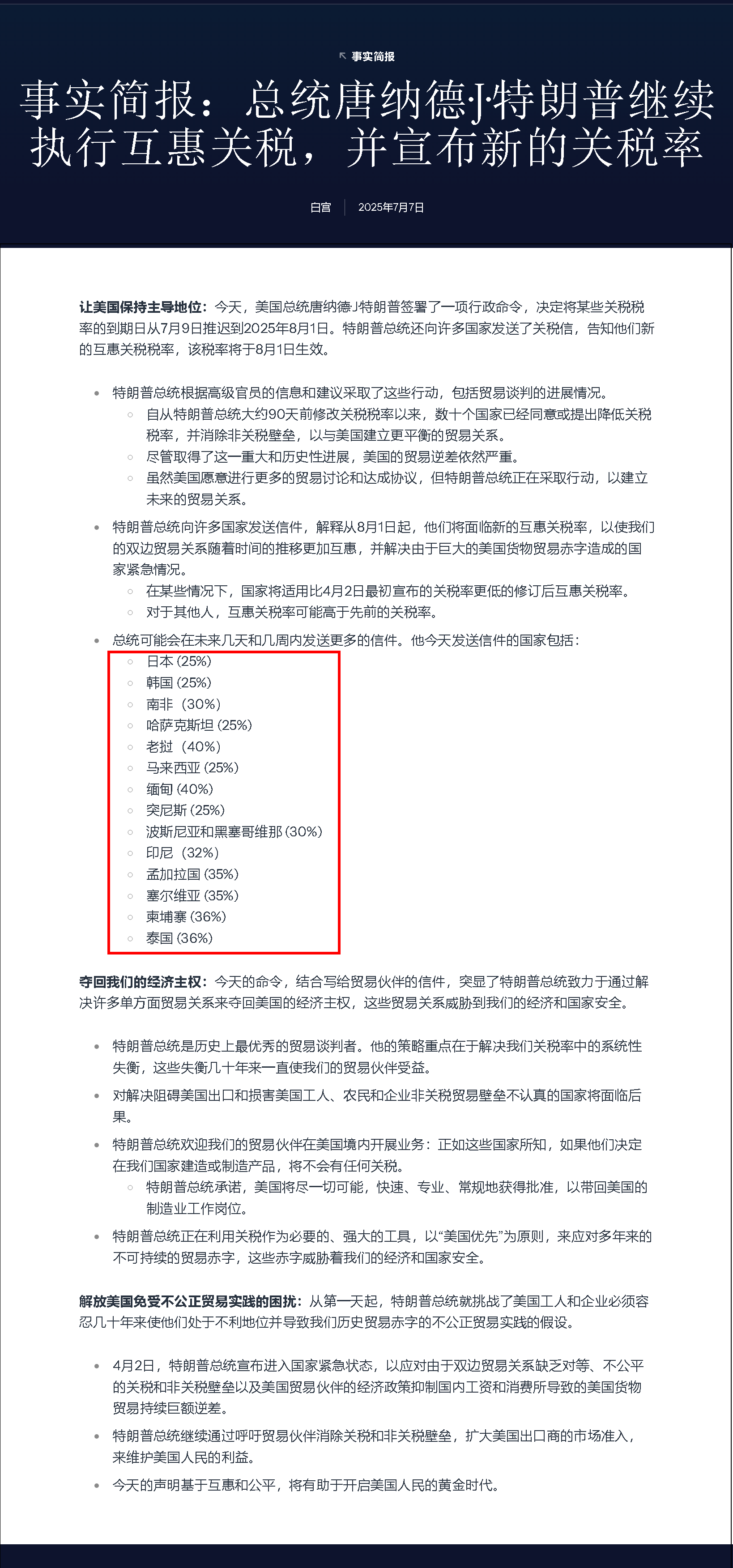 根據(jù)這些信的內(nèi)容,日本、韓國、馬來西亞、突尼斯、哈薩克斯坦將被征收25%的關稅,南非和波黑將被征收30%的關稅,印度尼西亞將被征收32%的關稅,塞爾維亞和孟加拉國將被征收35%的關稅,泰國和柬埔寨將被征收36%的關稅,老撾和緬甸則面臨高達40%的關稅。