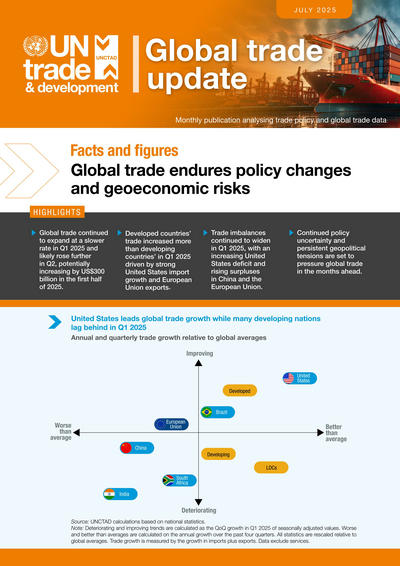 新華社日內(nèi)瓦7月8日電(記者焦倩)聯(lián)合國貿(mào)易和發(fā)展會議(貿(mào)發(fā)會議)8日發(fā)布報(bào)告稱,盡管今年上半年全球貿(mào)易預(yù)計(jì)增長3000億美元,但受美國貿(mào)易政策不確定性以及全球地緣政治緊張等因素影響,今年下半年全球貿(mào)易將面臨越來越大的阻力,不確定性增大。