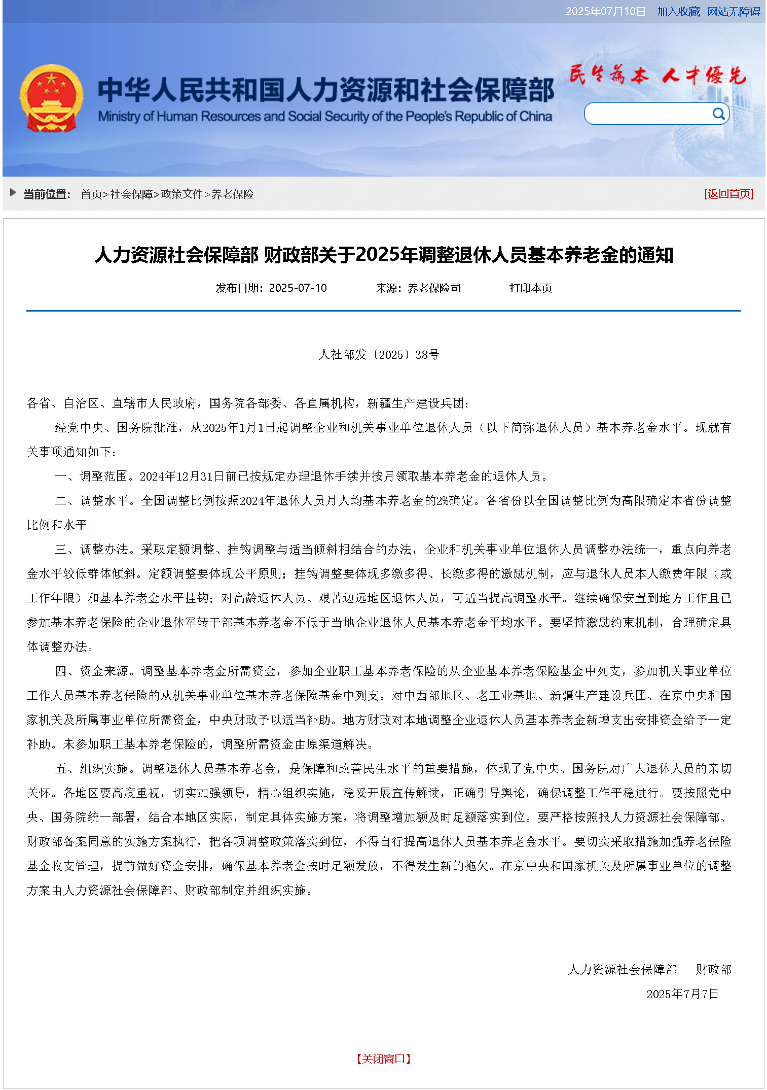人力資源社會(huì)保障部 財(cái)政部關(guān)于2025年調(diào)整退休人員基本養(yǎng)老金的通知