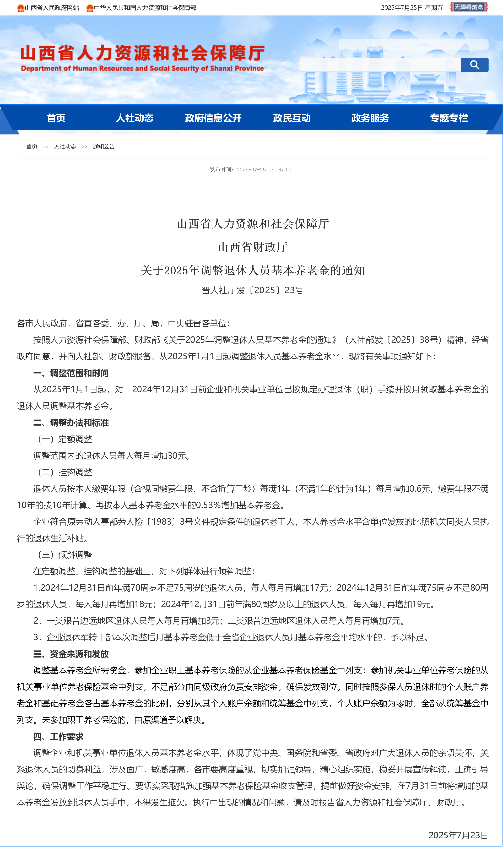 按照人力資源社會保障部、財政部《關(guān)于2025年調(diào)整退休人員基本養(yǎng)老金的通知》(人社部發(fā)〔2025〕38號)精神,經(jīng)省政府同意,并向人社部、財政部報備,從2025年1月1日起調(diào)整退休人員基本養(yǎng)老金水平,現(xiàn)將有關(guān)事項通知如下: