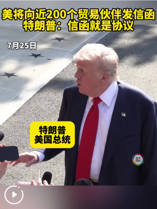 7月初,特朗普先后致信20多個(gè)國(guó)家領(lǐng)導(dǎo)人,稱(chēng)將從8月1日起對(duì)這些國(guó)家征收20%至50%不等的關(guān)稅。他曾于16日表示,有意對(duì)超過(guò)150個(gè)美國(guó)次要貿(mào)易伙伴統(tǒng)一加征關(guān)稅,稅率可能在10%至15%,美方尚未就此作出決定。(記者:郭倩;視頻:胡友松、張淼)