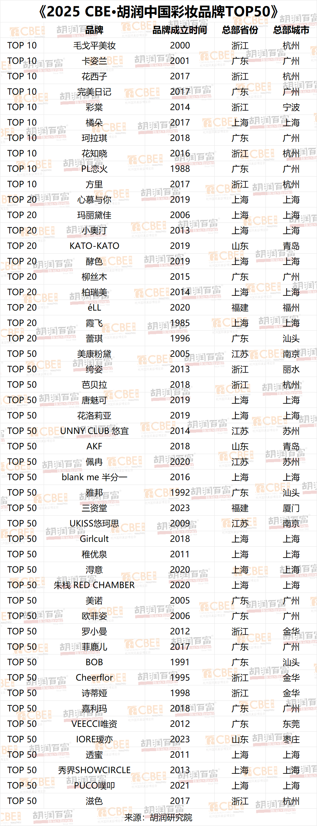 毛戈平美妝、卡姿蘭、花西子、完美日記、彩棠、橘朵、珂拉琪、花知曉、PL戀火、方里榮登“2025 CBE·胡潤(rùn)中國(guó)彩妝品牌TOP10”