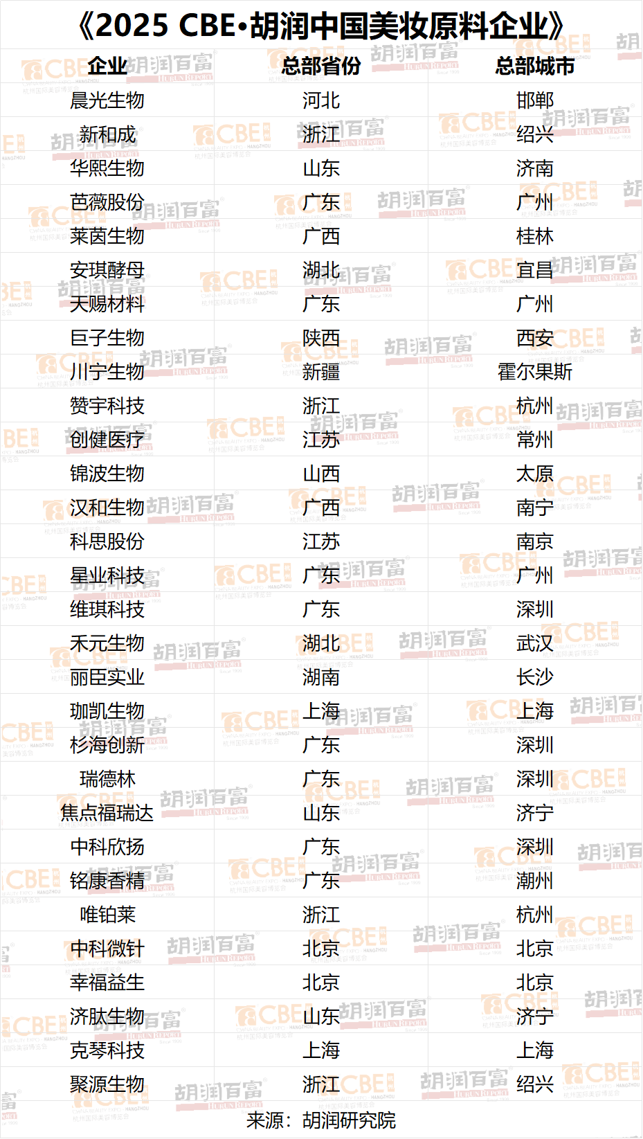 晨光生物、新和成、華熙生物等入選《2025 CBE·胡潤(rùn)中國(guó)美妝原料企業(yè)》