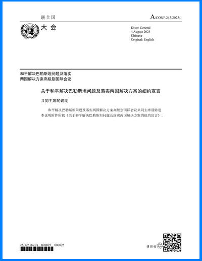 《紐約宣言》是今年7月在聯(lián)合國總部召開的有關(guān)巴勒斯坦問題國際會議產(chǎn)生的一個(gè)成果,該會議由法國和沙特阿拉伯共同主辦,并將于本月下旬繼續(xù)舉行。