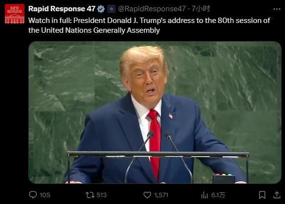 23日,特朗普在聯(lián)合國(guó)大會(huì)發(fā)表講話 推文截圖