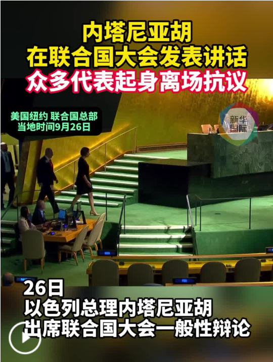 當日,以色列總理內(nèi)塔尼亞胡在第80屆聯(lián)合國大會一般性辯論發(fā)言。眾多聯(lián)合國會員國代表起身離席,退場抗議。新華社記者吳曉凌攝
