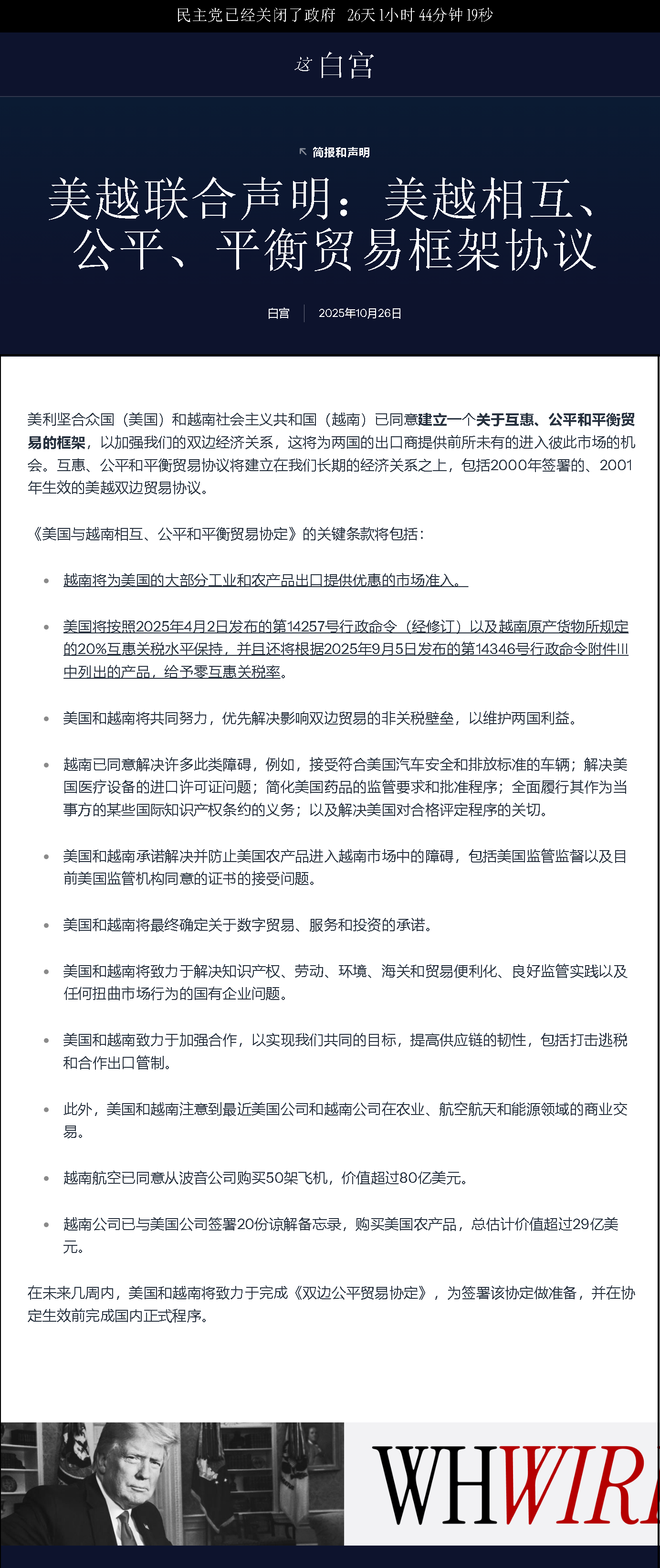 在中美兩國(guó)正在進(jìn)行經(jīng)貿(mào)談判之際,越南的突然出手引發(fā)了各方關(guān)注。10月26日,越南與美國(guó)聯(lián)合發(fā)表聲明,宣布達(dá)成了一項(xiàng)重要的經(jīng)貿(mào)協(xié)議框架,其中涉及對(duì)中國(guó)及其他國(guó)家的轉(zhuǎn)口貿(mào)易問(wèn)題。這一舉動(dòng)的背后,究竟隱藏著怎樣的戰(zhàn)略意圖?