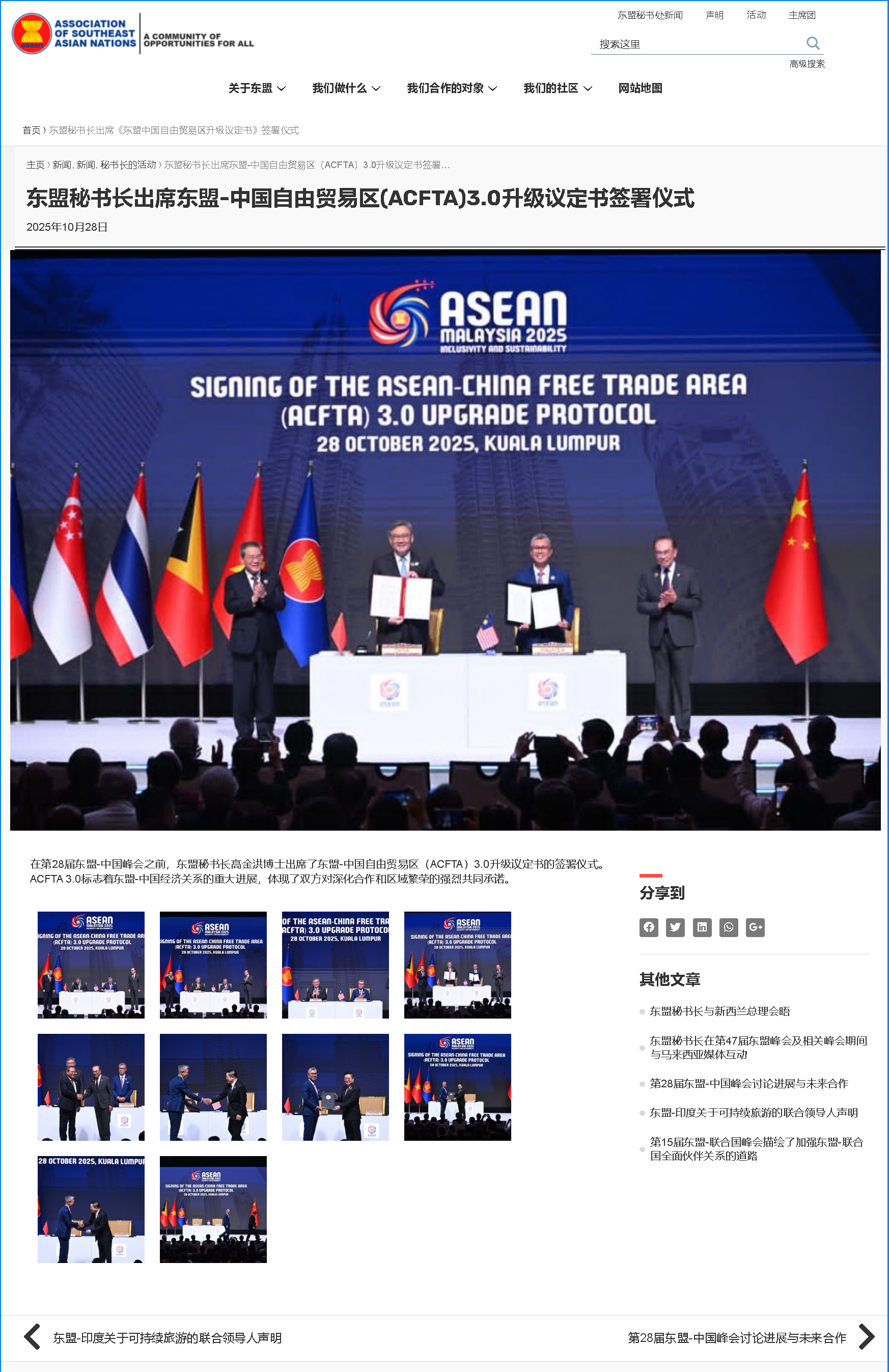 此后,雙方按照領(lǐng)導(dǎo)人指示,加緊開(kāi)展個(gè)別剩余條款技術(shù)磋商及議定書(shū)文本法律審核等后續(xù)工作。經(jīng)過(guò)4次特別聯(lián)委會(huì)及多輪工作組磋商,雙方于2025年5月全面完成3.0版談判。2025年10月28日,雙方在馬來(lái)西亞吉隆坡召開(kāi)的第28次中國(guó)—東盟領(lǐng)導(dǎo)人會(huì)議期間,正式簽署3.0版升級(jí)議定書(shū)。