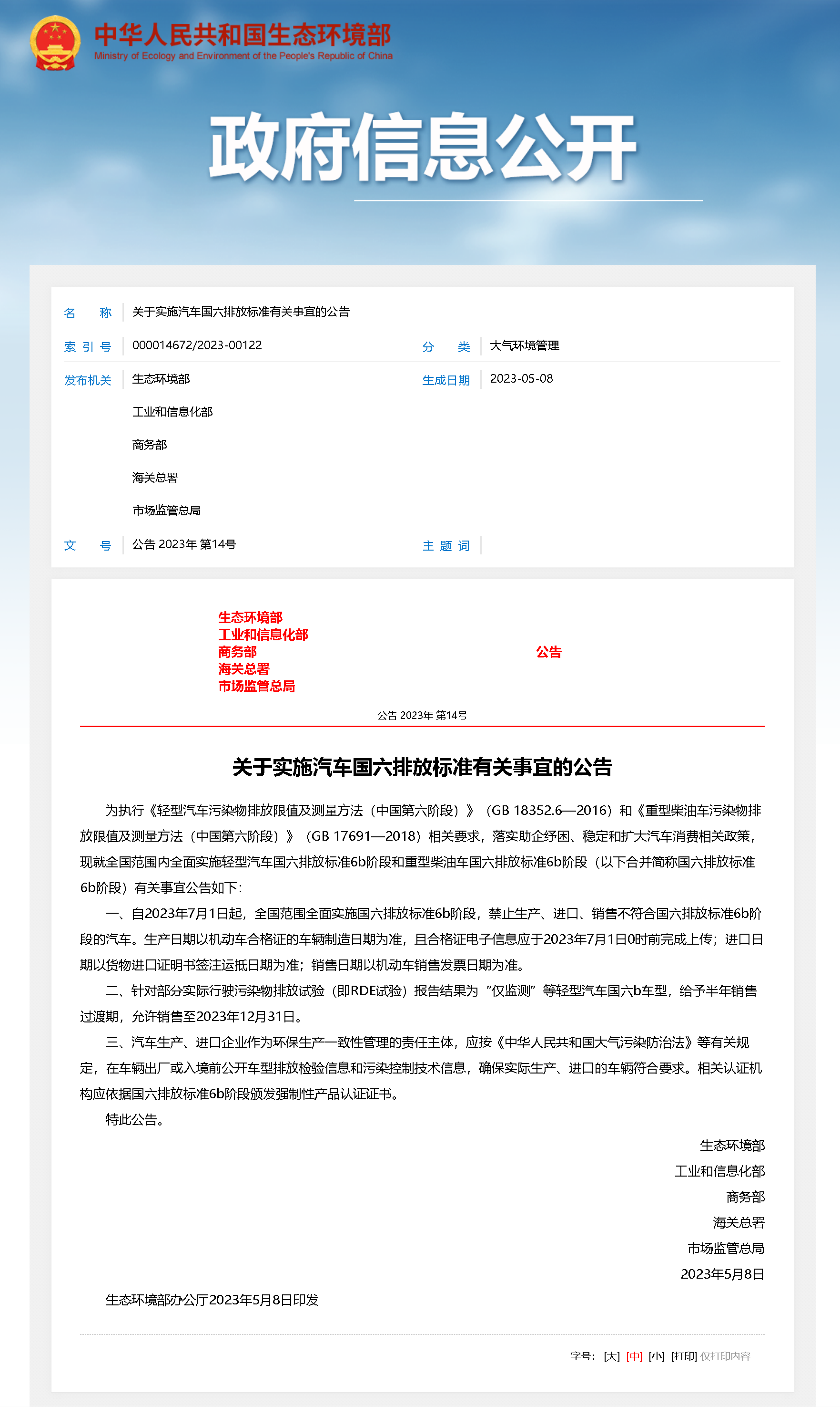 根據(jù)生態(tài)環(huán)境部、工信部、商務(wù)部、海關(guān)總署、市場(chǎng)監(jiān)管總局日前聯(lián)合發(fā)布的公告,本次汽車排放標(biāo)準(zhǔn)提升包括輕型汽車和重型柴油車。生產(chǎn)日期以機(jī)動(dòng)車合格證的車輛制造日期為準(zhǔn),且合格證電子信息應(yīng)于2023年7月1日0時(shí)前完成上傳;進(jìn)口日期以貨物進(jìn)口證明書簽注運(yùn)抵日期為準(zhǔn);銷售日期以機(jī)動(dòng)車銷售發(fā)票日期為準(zhǔn)。