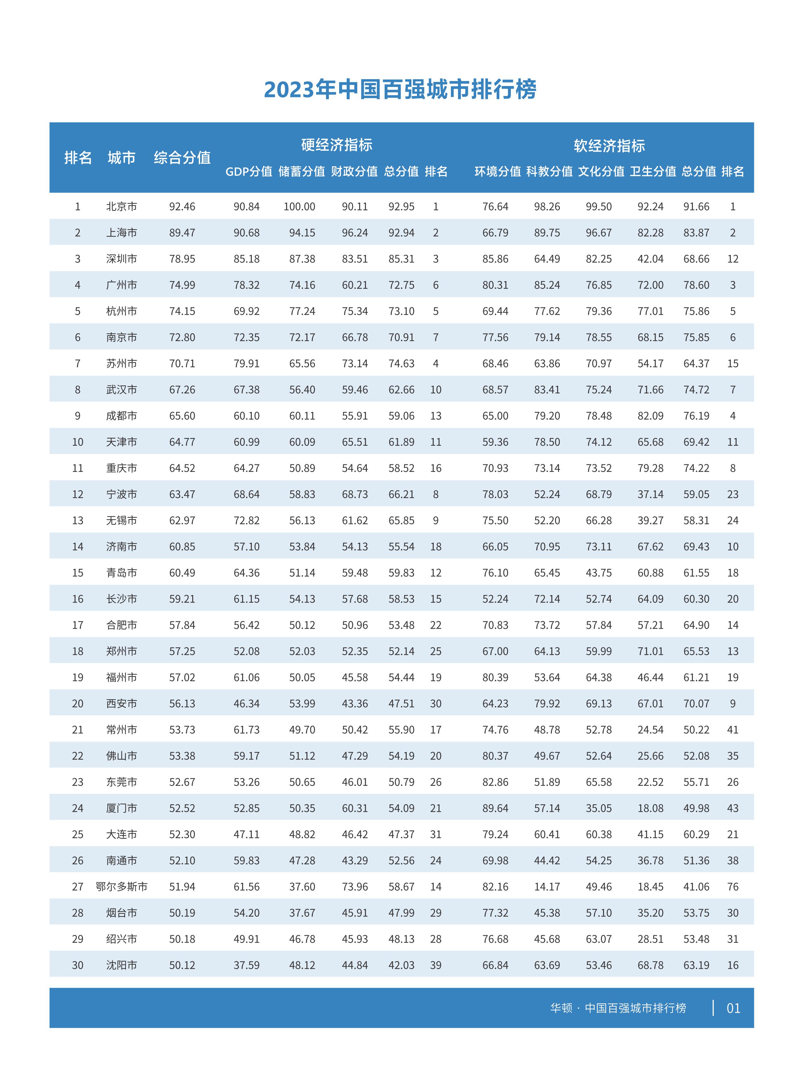 北京(92.46)、上海(89.47)繼續(xù)穩(wěn)坐前兩位,大幅領先于第三位深圳(78.95),而深圳也逐漸拉大了與廣州(74.99)的差距,進一步坐穩(wěn)中國第三城位置。廣州與第五位杭州(74.15)之間的差距近年來不斷縮小,杭州硬經(jīng)濟實力已經(jīng)超過廣州,軟經(jīng)濟指標中,文化和衛(wèi)生實力也優(yōu)勢明顯。