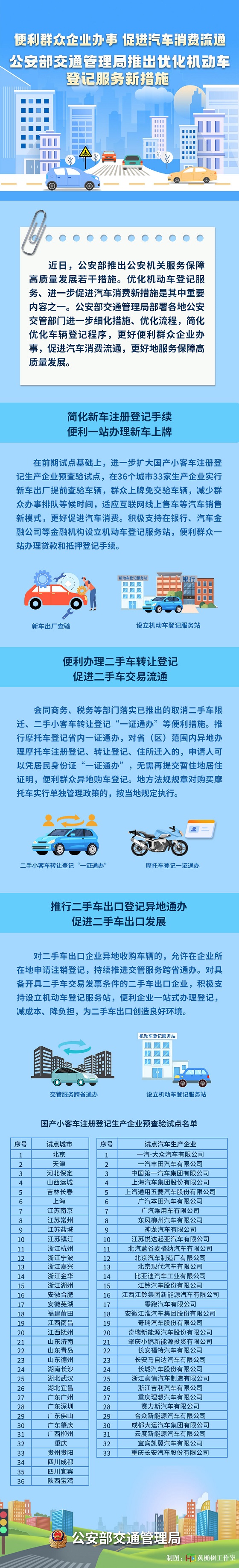 一、簡化新車注冊登記手續(xù),便利一站辦理新車上牌。在前期試點基礎上,進一步擴大國產(chǎn)小客車注冊登記生產(chǎn)企業(yè)預查驗試點,在36個城市33家生產(chǎn)企業(yè)實行新車出廠提前查驗車輛,群眾上牌免交驗車輛,減少群眾辦事排隊等候時間,適應互聯(lián)網(wǎng)線上售車等汽車銷售新模式,更好促進汽車消費。積極支持在銀行、汽車金融公司等金融機構設立機動車登記服務站,便利群眾一站辦理貸款和抵押登記手續(xù)。