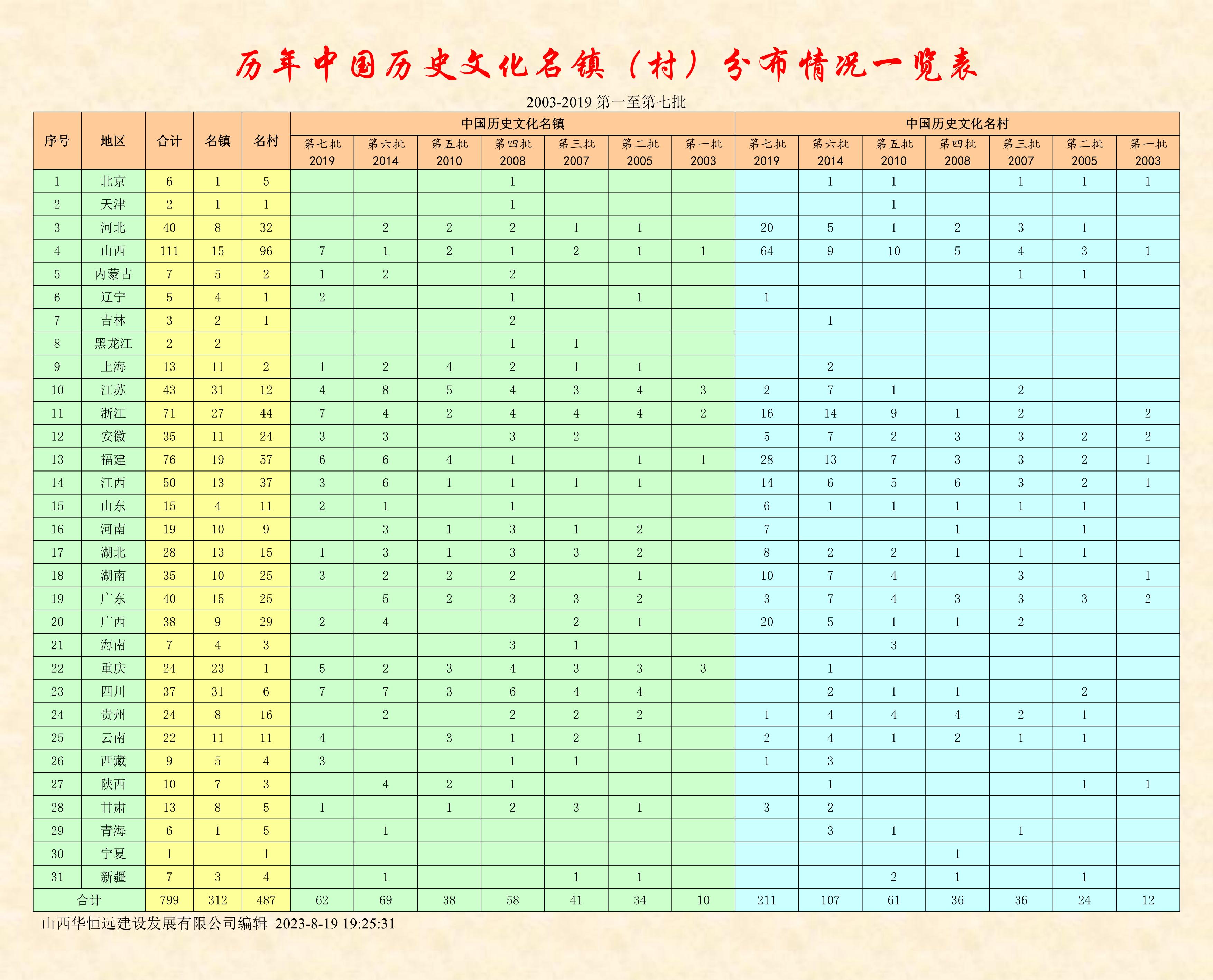 2003年10月,住房和城鄉(xiāng)建設(shè)部會同國家文物局公布了第一批22個中國歷史文化名鎮(zhèn)名村(10個鎮(zhèn)、12個村),至今累計公布了七批共計799個中國歷史文化名鎮(zhèn)名村,其中,中國歷史文化名鎮(zhèn)312個,中國歷史文化名村487個。一大批古鎮(zhèn)、古村落被納入保護(hù)名錄,得到真實、完整的保護(hù),為全面系統(tǒng)地保護(hù)好各類歷史文化資源、講好中國故事、傳承好中華文明奠定了重要基礎(chǔ)。