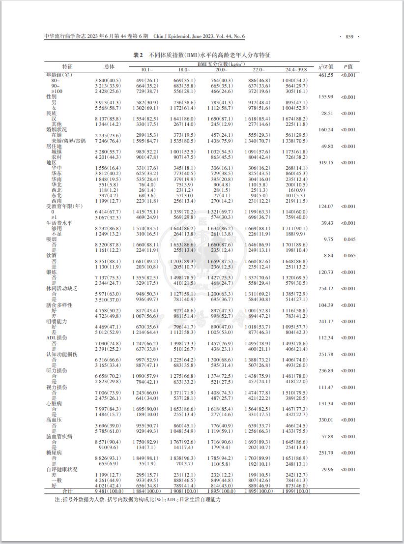 根據(jù)指南,高齡老年人指實(shí)足年齡大于或等于80歲的人。體質(zhì)指數(shù)(BMI)是一種計(jì)算身高體重的指數(shù),即體重與身高平方的比值。體質(zhì)指數(shù)適宜范圍指不良健康結(jié)局的發(fā)生風(fēng)險(xiǎn)相對(duì)較低的處于某一特定范圍內(nèi)的人體(群)BMI。