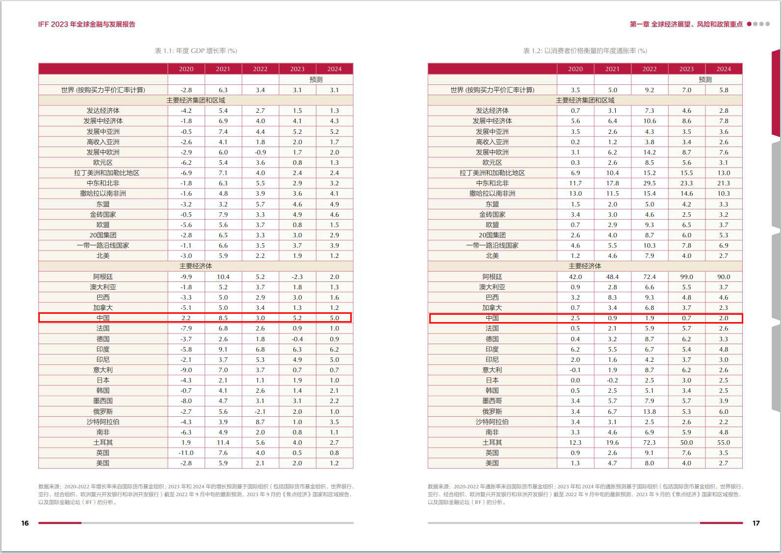 中新網(wǎng)廣州10月28日電(中新財經(jīng) 宮宏宇)“2023年全球經(jīng)濟增長進一步放緩,預期增長3.1%,低于2022年的3.4%。2024年,全球經(jīng)濟增長預計將保持在3.1%的疲軟水平。中國經(jīng)濟2023年和2024年預計將分別增長5.2%和5%?!眹H金融論壇(IFF)20周年全球年會上最新發(fā)布的《IFF2023年全球金融與發(fā)展報告》指出。